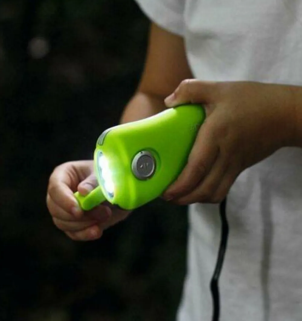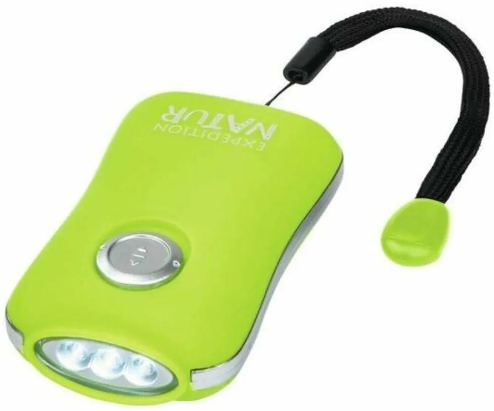 Deze kleine zaklamp is voorzien van een dynamo dat zich oplaadt als je aan de slinger draait (ca. 60 seconden draaien voor 10 minuten licht). Met een knopje kan het lampje aan- of uitgezet worden. Verkrijgbaar in groen of oranje.