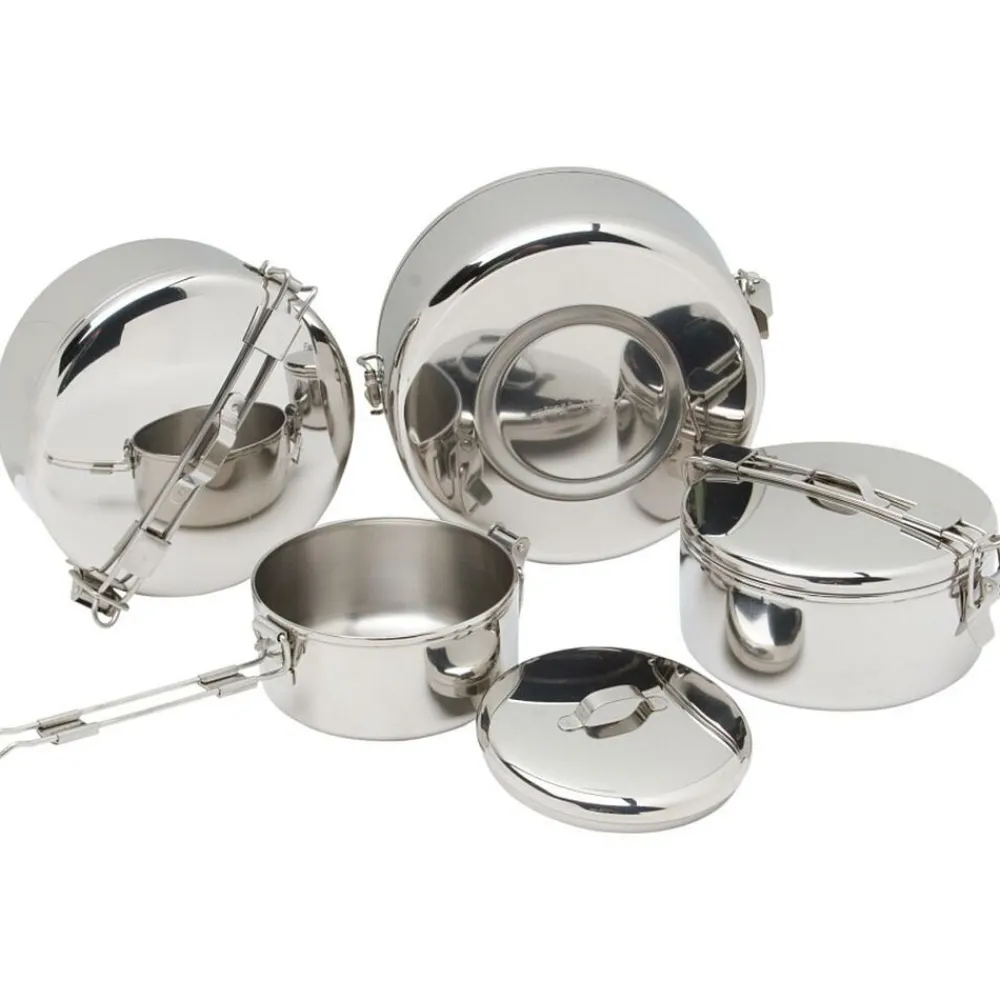 De Stowaway Pot van MSR is een stevige roestvrijstalen pannenset. De pannen zijn zeer duurzaam en doordat de deksel vast te maken is kunnen ze als ze niet worden gebruikt om te koken gemakkelijk andere dingen vervoeren.