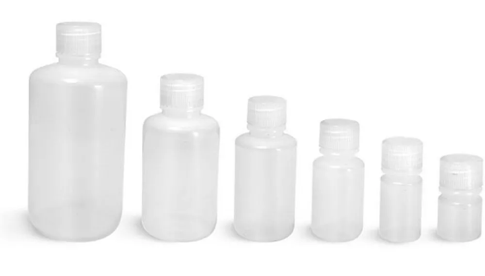 Fles met smalle dop van Nalgene. Beschikbaar in verschillende maten. Flessen zijn in kleur matwit maar mogen mee in het vliegtuig doordat de vloeistof zichtbaar is