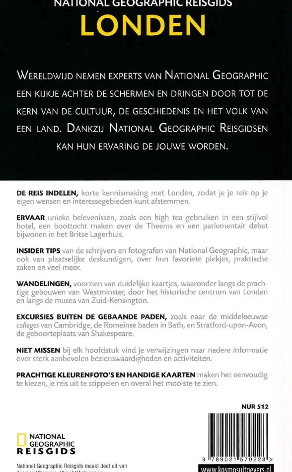 Nederlandstalige uitgave van de National Geographic Reisgids. Een mooie lay-out maakt de omvangrijke gids goed toegankelijk. De gids start met een hoofdstuk over geschiedenis en cultuur, met aparte paragrafen over de kunst, festivals en eten en drinken. Op pagina 47 begint de gids met een beschrijving van de Theems (met 2 boottochtjes) en gaat dan verder met The City, het hart van Londen. Vervolgens komen de andere wijken aan bod van Westminster tot Chelsea, Belgravia en Knightsbridge. Ook uitstapjes buiten Londen (o.a. Windsor en Canterbury maar ook Oxford) komen voorbij. De beschreven onderwerpen zijn goed gekozen, er is veel aandacht voor cultuur. Het boek eindigt met ruim 25 pagina’s reisinformatie. Prachtig als kennismaking, al was het maar vanwege de fotografie. De gids is rijk geïllustreerd met een groot aantal detailkaarten en foto’s in kleur, al doen de foto’s wel wat ouderwets aan. De uitslaande flappen bevatten een overzichtskaart en een metrolijn. Met register.