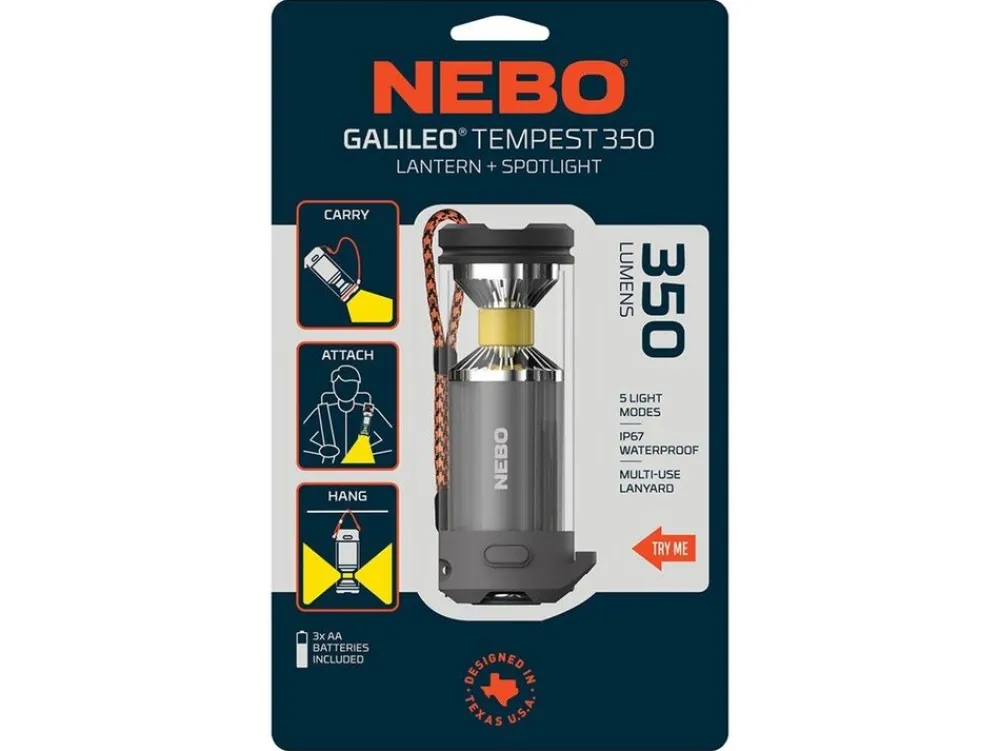 licht en veelzijdigheid die klaar is om je buitenervaringen te verbeteren. Doormiddel van zijn ARCUS COB LED’s kan de lamp zo wel 120 als 360 graden licht geven (wit). Ook kan hij 360 graden rood licht geven. De Galileo kan ook gebruikt worden als zaklamp, waarmee je tot wel 112 meter ver kan schijnen. De Tempest is door zijn kleine formaat, laag gewicht en vele montage mogelijkheden gemakkelijk mee te nemen. De lamp is te bevestigen via de magneet op de achterkant of doormiddel van het polskoord. Het polskoord kan om de lamp gewikkeld worden en is vervolgens te gebruiken als handvat.