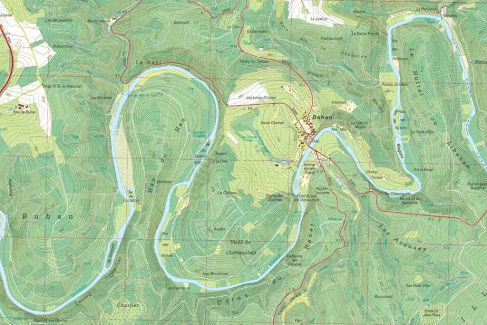 - hoogtelijnen, bosgebieden, bospaden, open weides, akkers, brandgangen en waterlopen