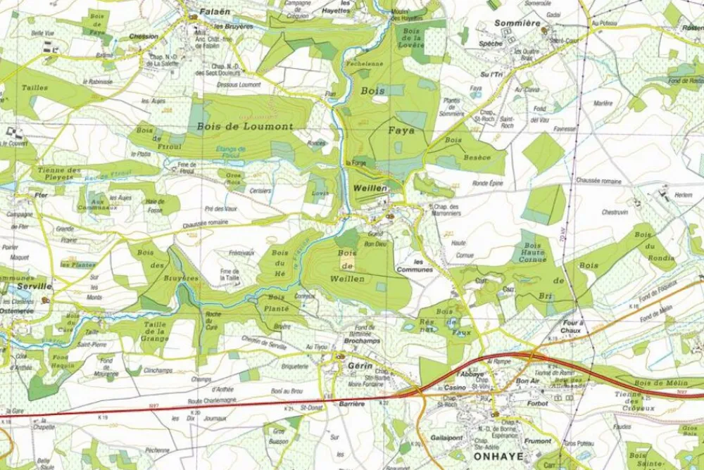 - hoogtelijnen, bosgebieden, bospaden, open weides, akkers, brandgangen en waterlopen
