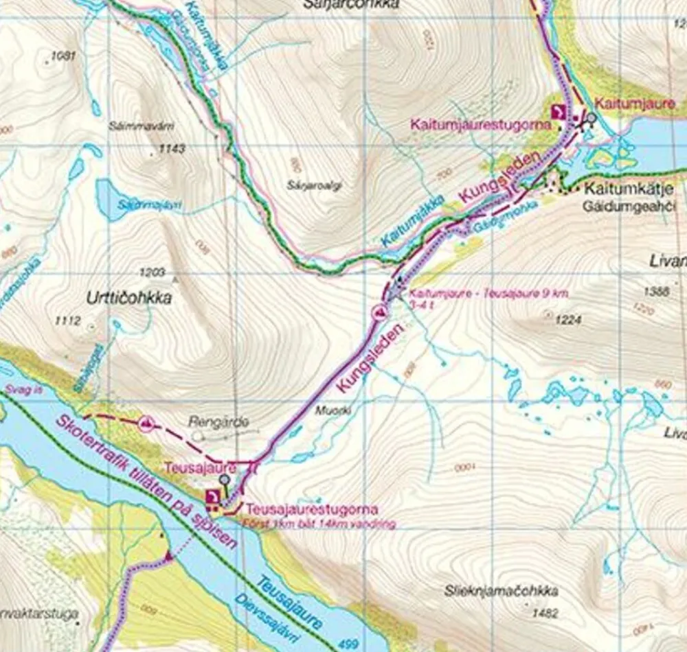 - gemarkeerde en ongemarkeerde wandelpaden, waaronder de Kungsleden