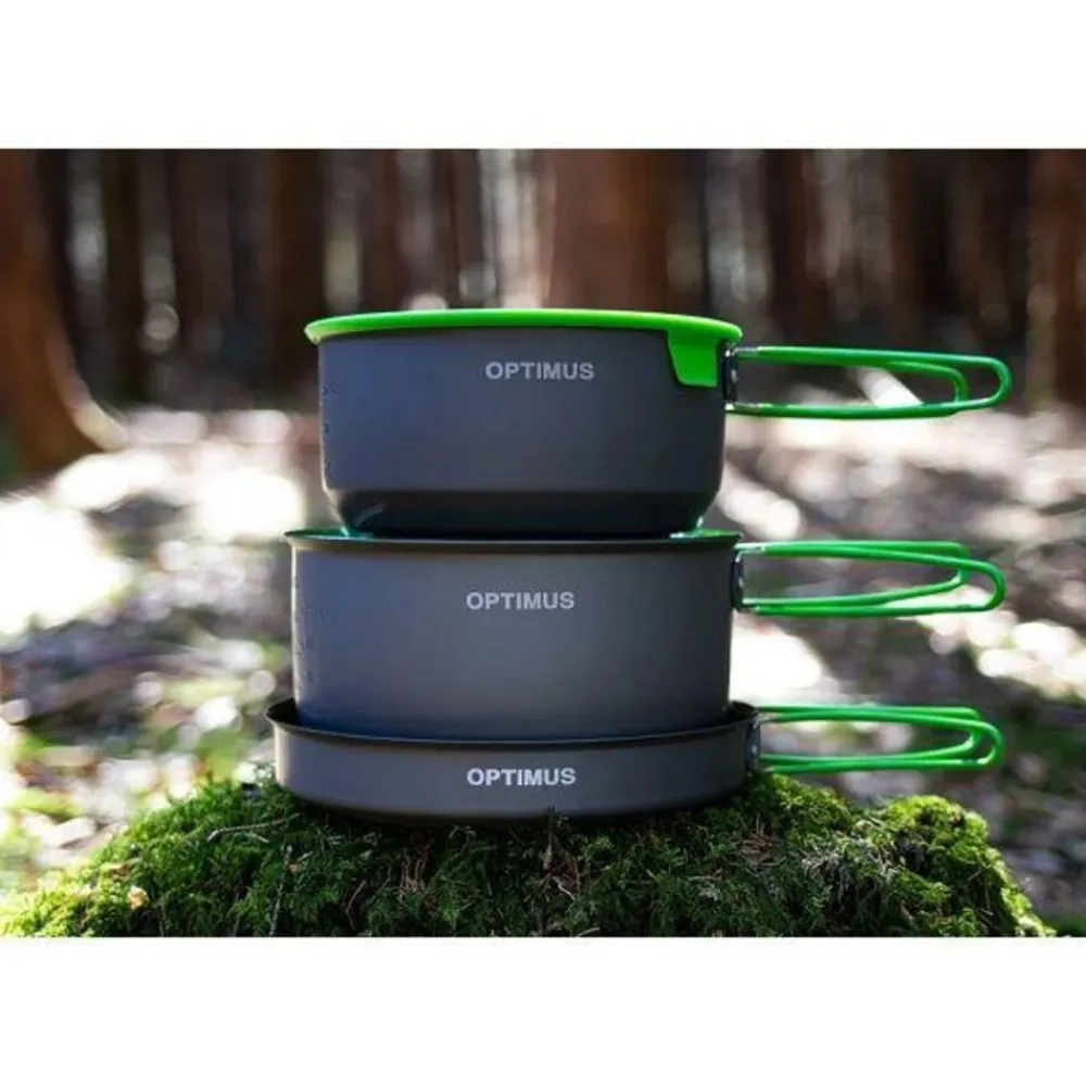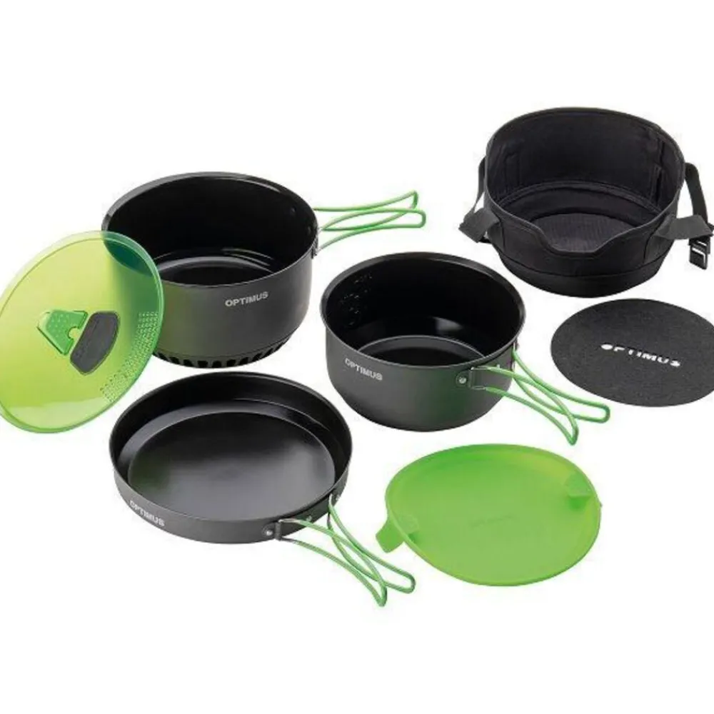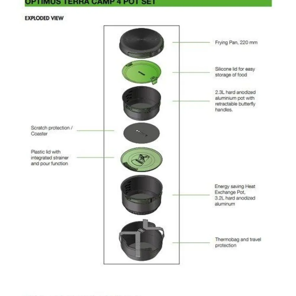 De Optimus Terra Camp 4 is een complete 7-delige pannenset voor kampeerders en backpackers die koken voor 3 tot 4 personen. De set bestaat uit twee aluminium kookpannen (3,2 en 2,3 liter), een koekenpan met keramische antiaanbaklaag, twee deksels (waarvan één met afgietfunctie), een neopreen thermotas en een onderzetter.
