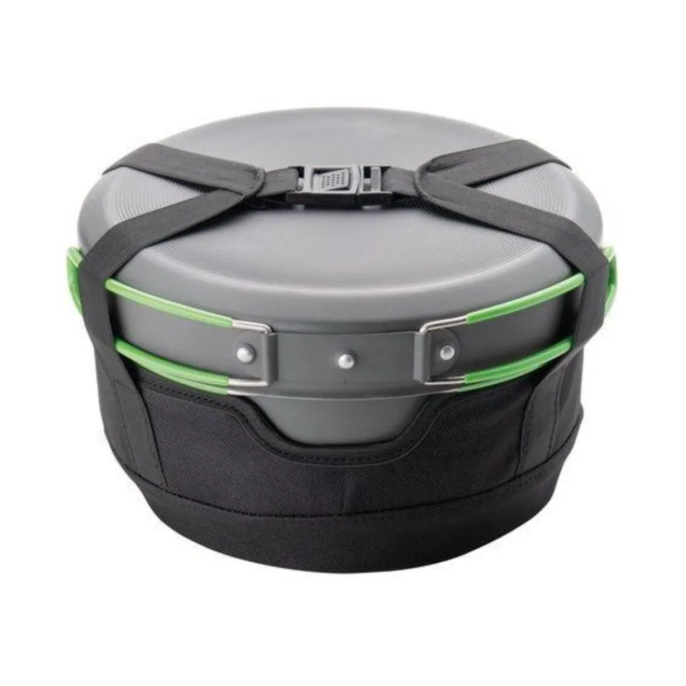 Dankzij de geïntegreerde warmtewisselaar onder de grootste pan kookt water sneller en wordt brandstof bespaard. Alle onderdelen passen compact in elkaar en kunnen worden opgeborgen in de meegeleverde thermotas.