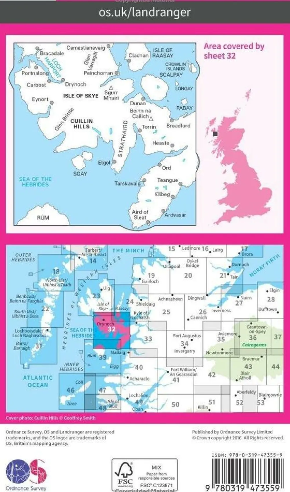 Zeer gedetailleerde, topografische wandelkaart Ordnance Survey Landranger 032 voor het gebied South Skye & Cuillin Hills: een National Scenic Area of Scotland.