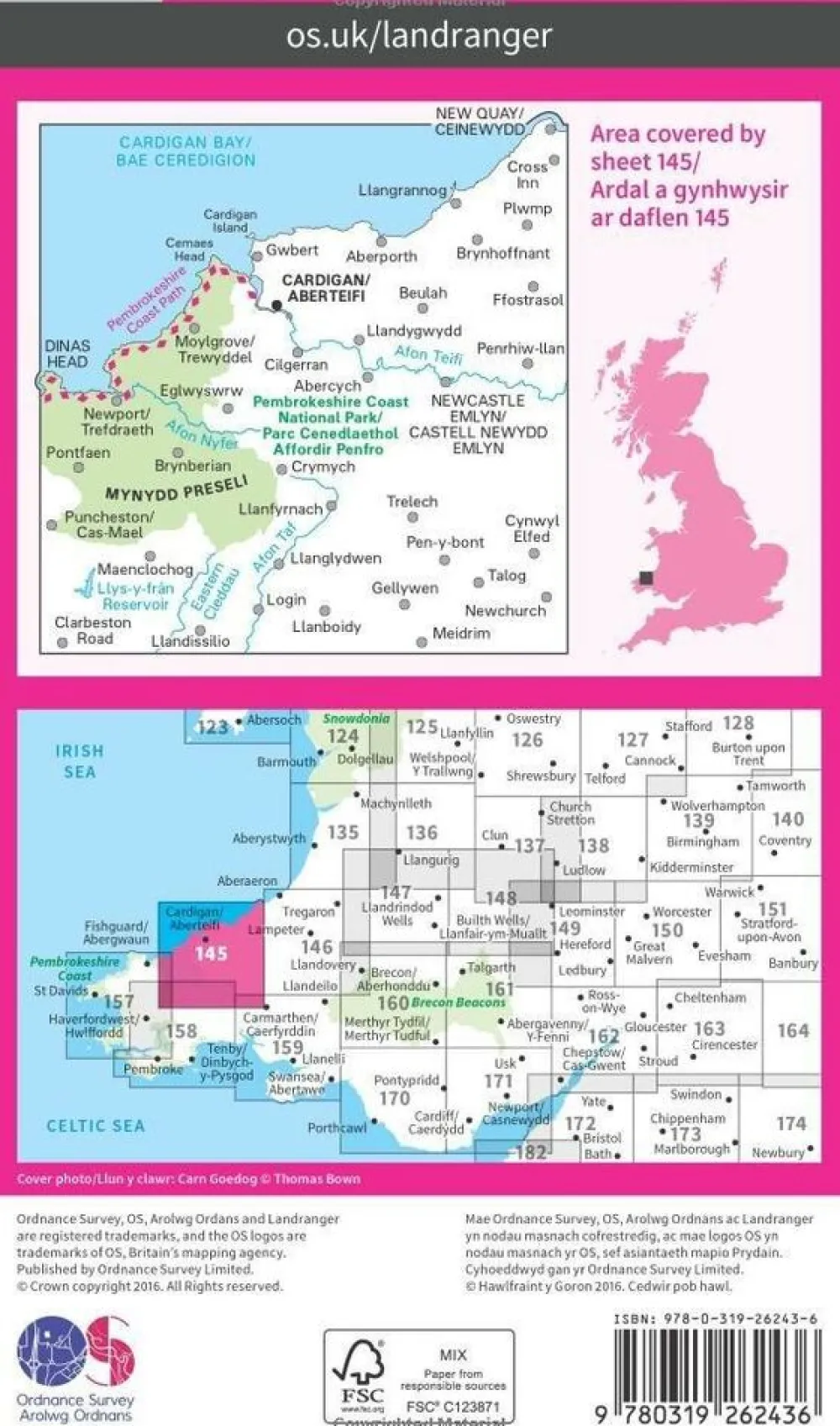 Zeer gedetailleerde, topografische wandelkaart Ordnance Survey Landranger 145 voor het gebied rond Cardigan & Mynydd Preseli: met een deel van het Pembrokeshire Coast Path door het Pembrokeshire Coast National Park