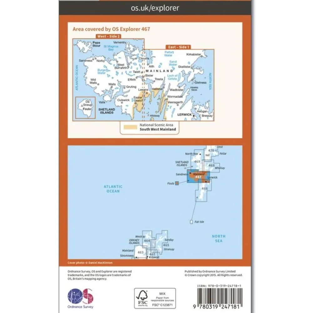 The southern end of the Setland Isles’ mainland, OS Explorer map 466 is the ideal companion for walking, cycling, birdwatching and any outdoor pursuits. This map includes Lerwick, Fair Isle and the National Scenic Area.