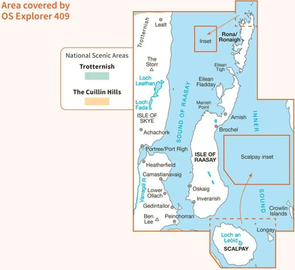 Zeer gedetailleerde, gelamineerde Active Explorer kaart 409 voor het oosten van Skye – Raasay, Rona en Scalpay.