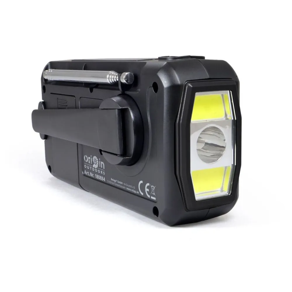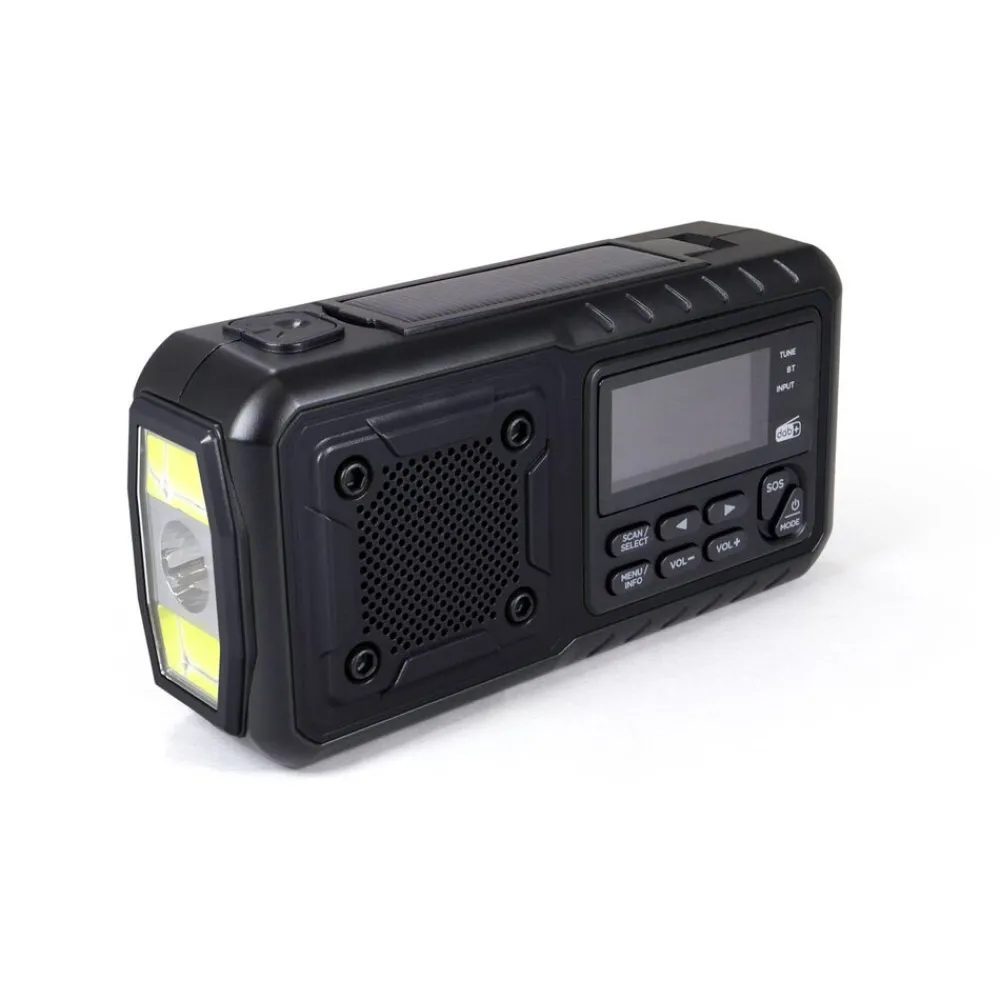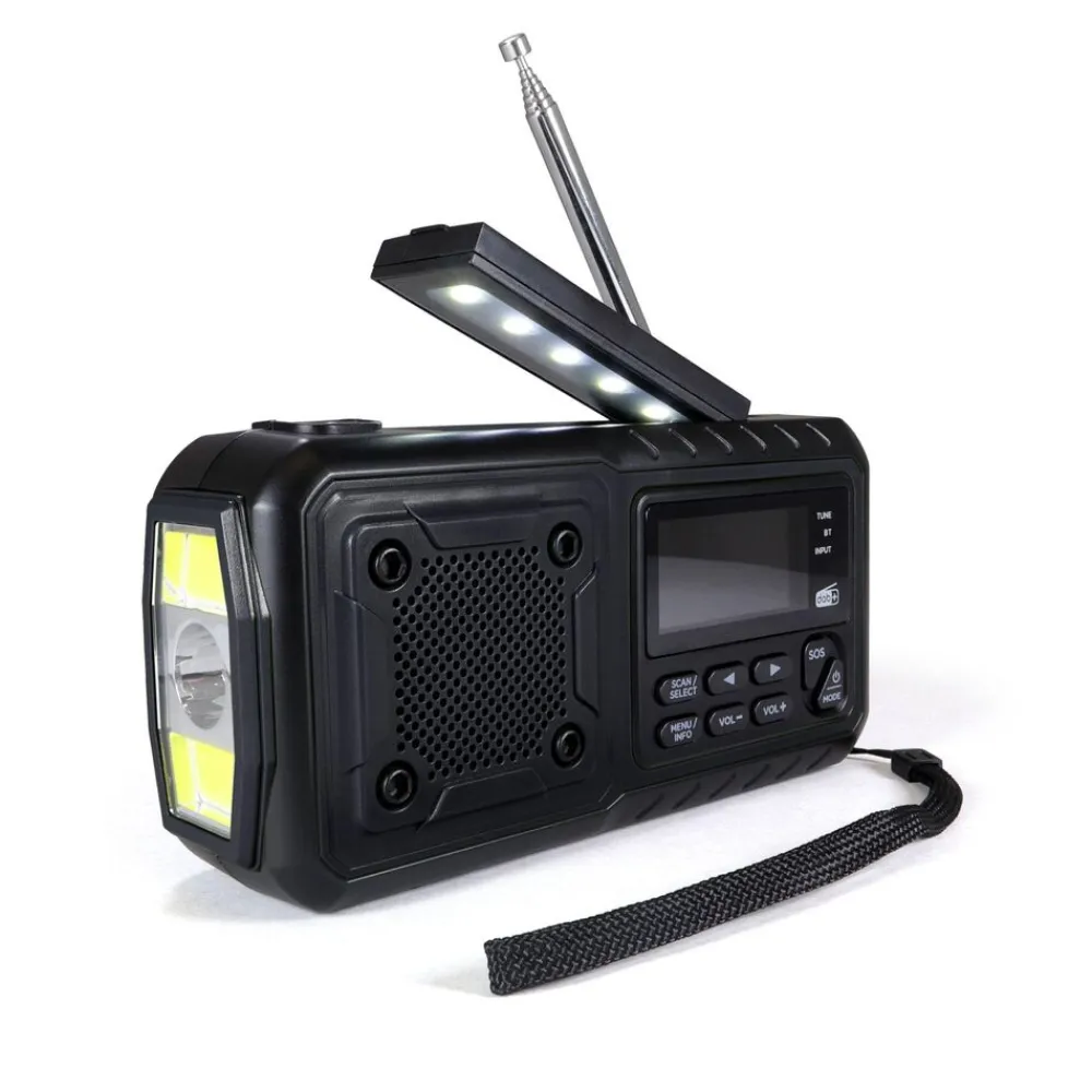 De compacte en robuuste zwengelradio is altijd en overal inzetbaar. Hij ontvangt berichten via FM, DAB+ en heeft de optie om verbonden te worden via Bluetooth. De radio heeft een geïntegreerde en oplaadbare lithiumbatterij die kan worden opgeladen via USB Type-C, de geïntegreerde zwengelgenerator of, in geval van nood, via de geïntegreerde zonnecel in de zon. Daarnaast kan de noodradio ook worden gebruikt met standaard AAA-batterijen. Uitgerust met powerbank (4000mAh), zaklamp en leeslamp, wekker, datum- en tijdweergave, geheugen voor maximaal 40 zenders, hoofdtelefoonaansluiting, SOS-alarmknop en ophanglus. De krachtige zaklamp kan worden gebruikt met drie verschillende lichtstanden. De SOS alarmknop activeert een luid alarm om aandacht te trekken in geval van nood. Ideaal voor kamperen en buitenactiviteiten.