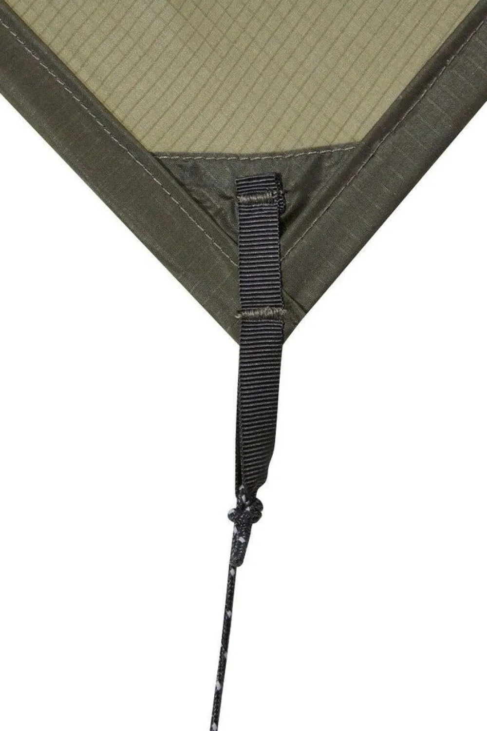 Het doek is gemaakt van stevig, gesiliconiseerd 30D Cordura met een PU-coating. Ultralicht en waterdicht, het is ongelooflijk sterk met een getapete, bovenliggende noknaad om het doek strak te houden, waardoor regen soepel wegvloeit en klapperen in de wind wordt voorkomen. De acht spanpunten zijn versterkt voor extra stevigheid en met vier centrale hijspunten zijn er verschillende opstellingsopties beschikbaar. Deze tarp/shelter is inclusief negen haringen en zes scheerlijnen.
