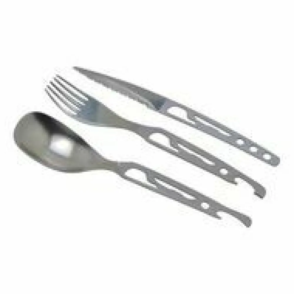 De Baladeo Basecamp is een handige RVS-bestekset (vork, mes, lepel) van Relags. Geleverd in neopreen beschermhoes en met mini-karabiner.