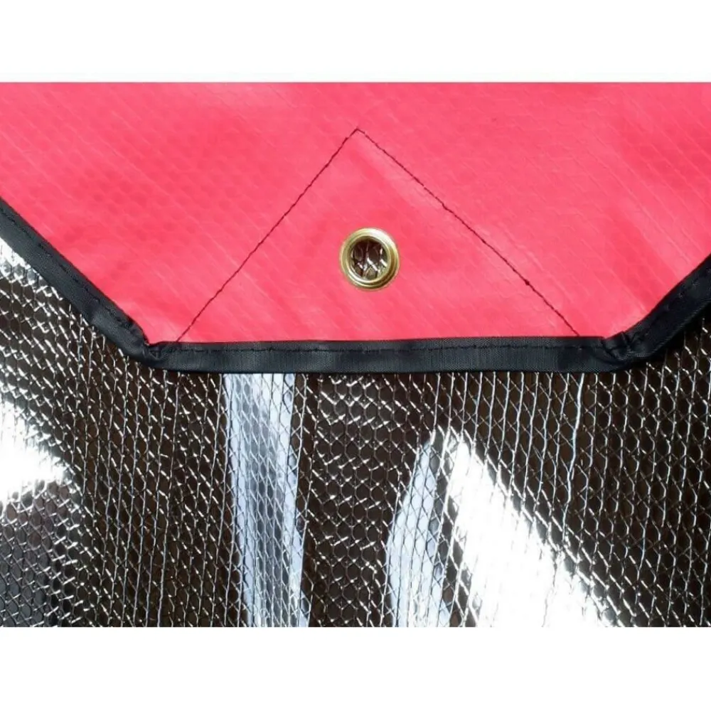 Reddingsdeken met textiel versterking en geplakte naden. Voorzien van vierversterkte punten voor betere bevestiging. Kan worden gebruikt als een buitentent of grondzeil.
