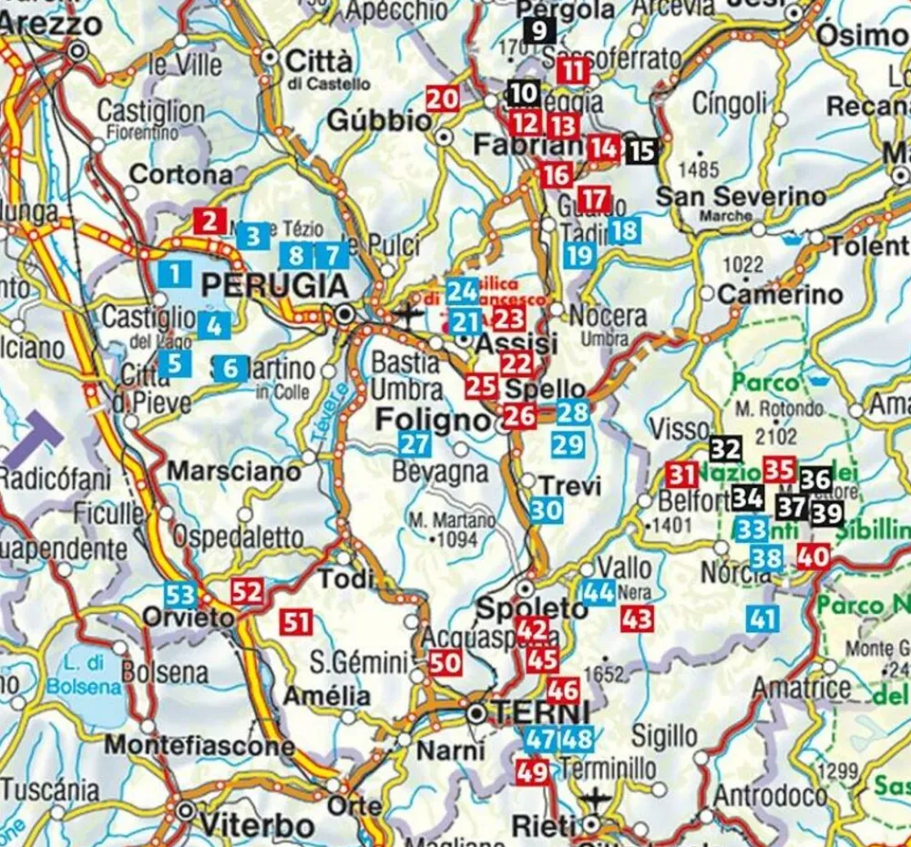Die Tourenvorschläge führen durch altes Kulturland, vorbei an tosenden Wasserfällen und durch liebliche Flussauen. Auf genussvollen Wegen lässt sich die Landschaft erkunden. Mit den Ordensgründern Franz von Assisi und Benedikt von Norcia hat die Region zwei der größten Heiligen der Christenheit hervorgebracht. Ihre und viele andere Klöster und malerische alte Städte lassen sich auf den Wanderungen besichtigen. Mit etlichen Zweitausendern im Nationalpark Monti Sibillini im Apennin stehen auch anspruchsvolle Bergtouren auf dem Programm.