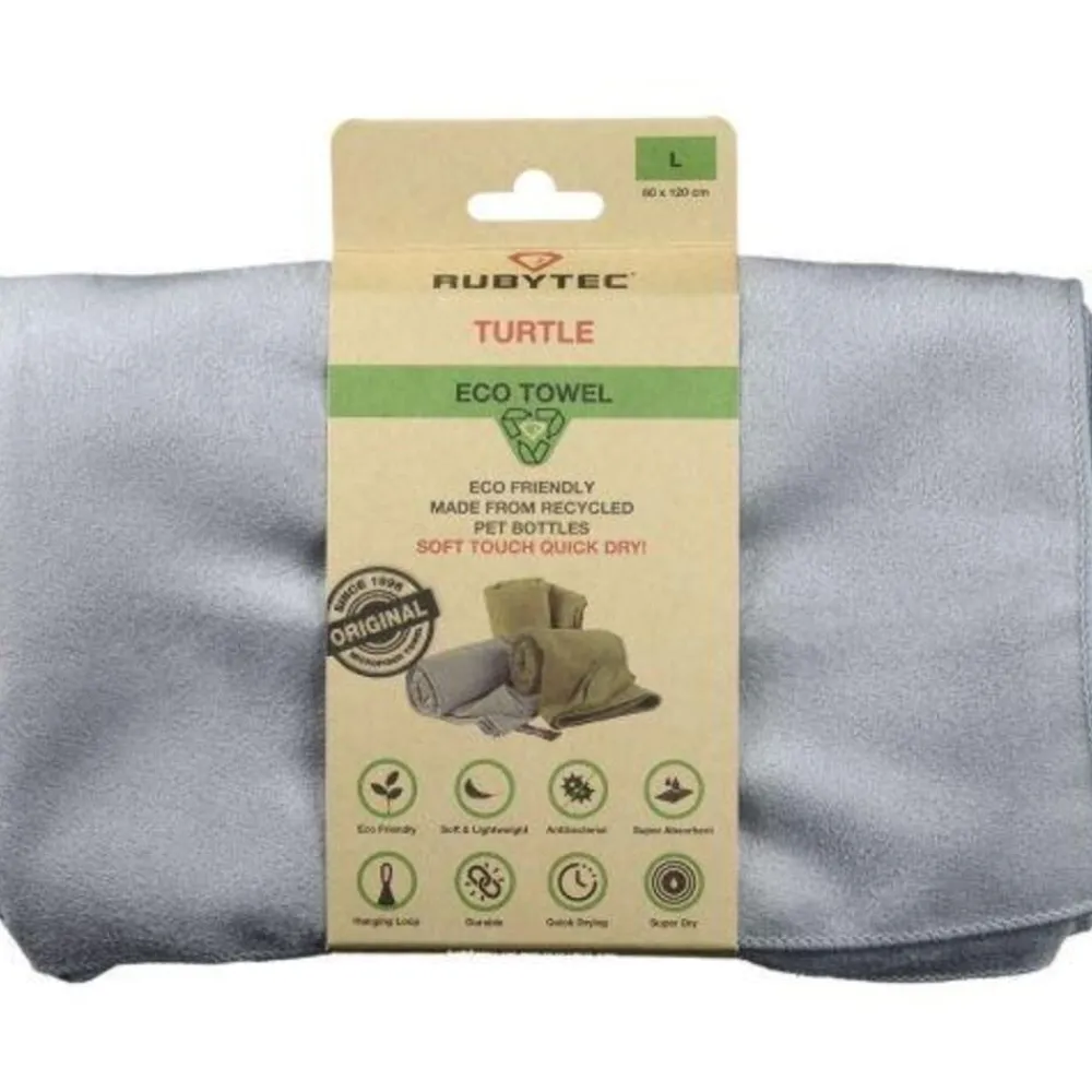 De Turtle Eco Towel van Rubytec is een handdoek gemaakt van zacht microvezel. Deze absorbeert tot drie keer zijn gewicht aan water. De sneldrogende technologie zorgt ervoor dat het veel sneller droogt dan een gewone katoenen handdoek. Machine wasbaar tot 40°C. De antibacteriële eigenschappen verminderen de groei van geurveroorzakende bacteriën. De handdoeken zijn zeer licht en kunnen tot zeer kleine afmetingen worden verpakt. Gemaakt van gerecyclede PET-flessen. Voelt zacht aan en is snel droog!