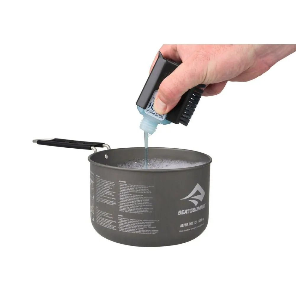 Gemakkelijk vast te houden, gemakkelijk te gebruiken, de Camp Kitchen Pot Scrubber van Sea To Summit bevat een fles van 50 ml Wilderness Wash, klaar om aangekoekte voedselresten van het koken te verwijderen. Nylon borstelharen en de geïntegreerde schraper zorgen ervoor dat je potten en servies echt schoon zijn – niet alleen kampeerschoon.