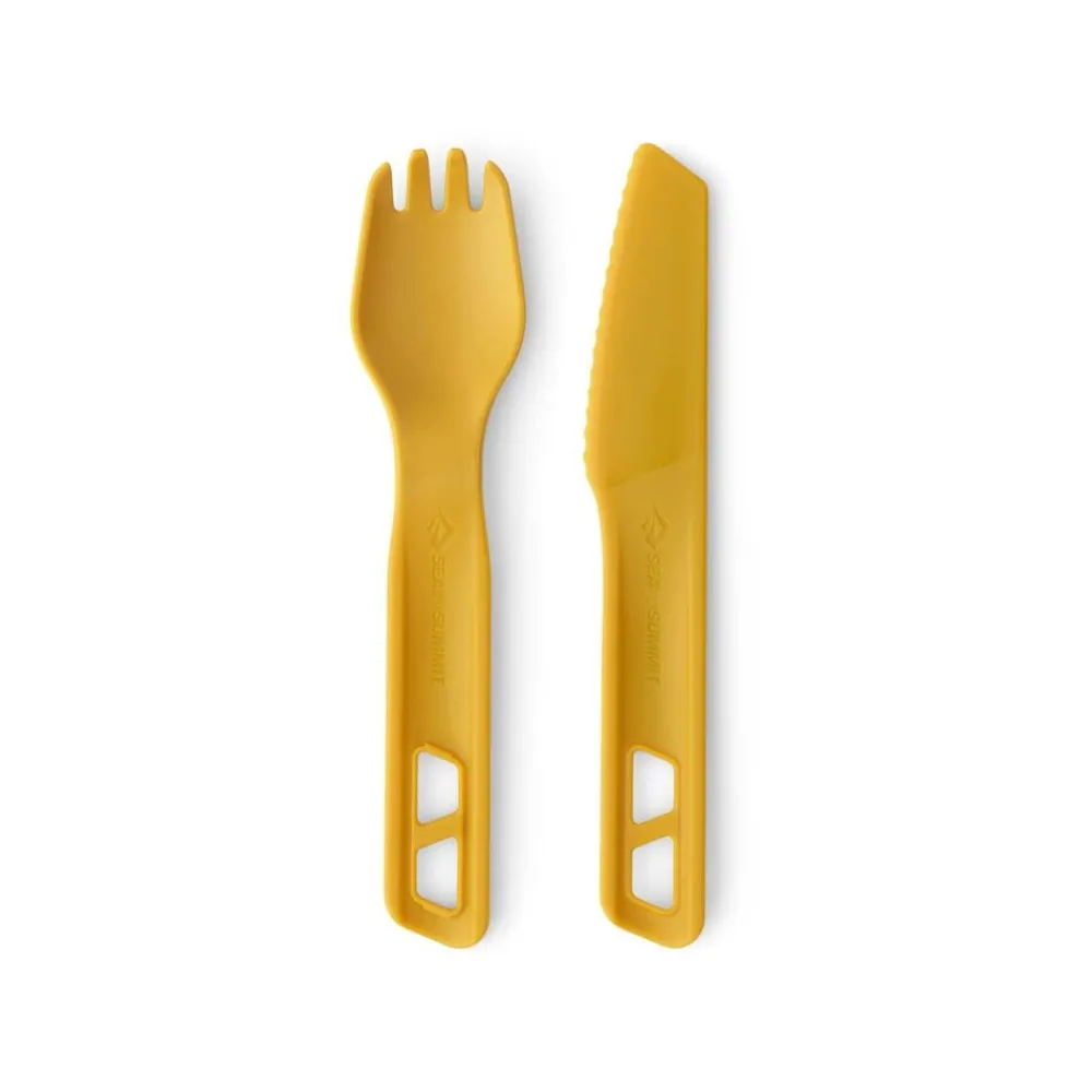 2-delige bestekset van Sea to summit. Het mes en de vork zijn inklikbaar om een lang handvat te creëren.
