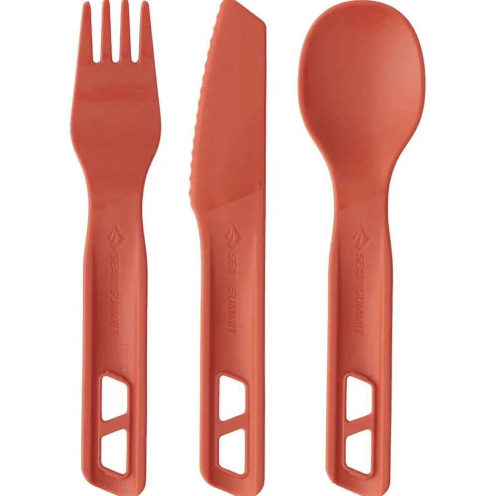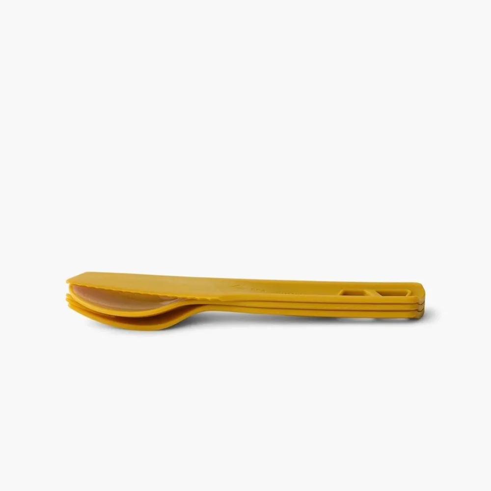 3-delige bestekset van Sea to summit. Het mes en de vork zijn inklikbaar om een lang handvat te creëren.