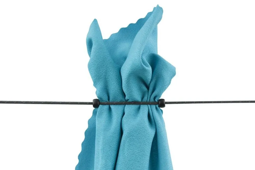 Meest slimme waslijn in de wereld met gepatenteerd klemsysteem. Door de heen en weer te verschuiven knikkers op een dubbele lijn, kun je zonder knijpers de was veilig ophangen