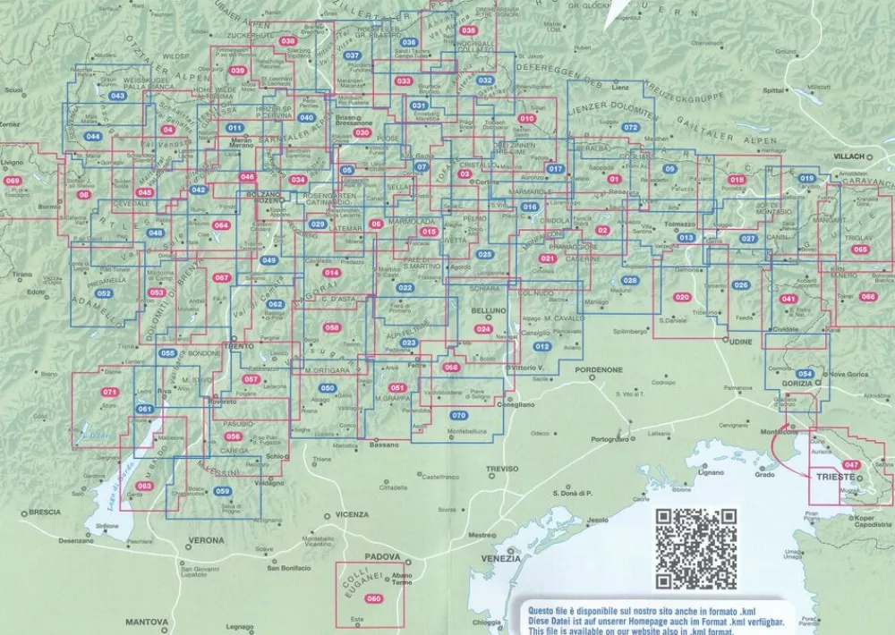 Tabacco kaarten bedekken de gehele Dolomieten en Südtirol/ Zuid-Tirol rond Bolzano, Bressanone, Tolmezzo, Cortina d’Ampezzo, Trento, Sella, Brunico, Tre Cime, Marmolada, Belluno, Val Gardena, Val Venosta, Ortler, Monte Baldo. Het zijn uitstekende wandelkaarten om een mooie wandeling, trektocht of via ferrata op uit te zetten.
