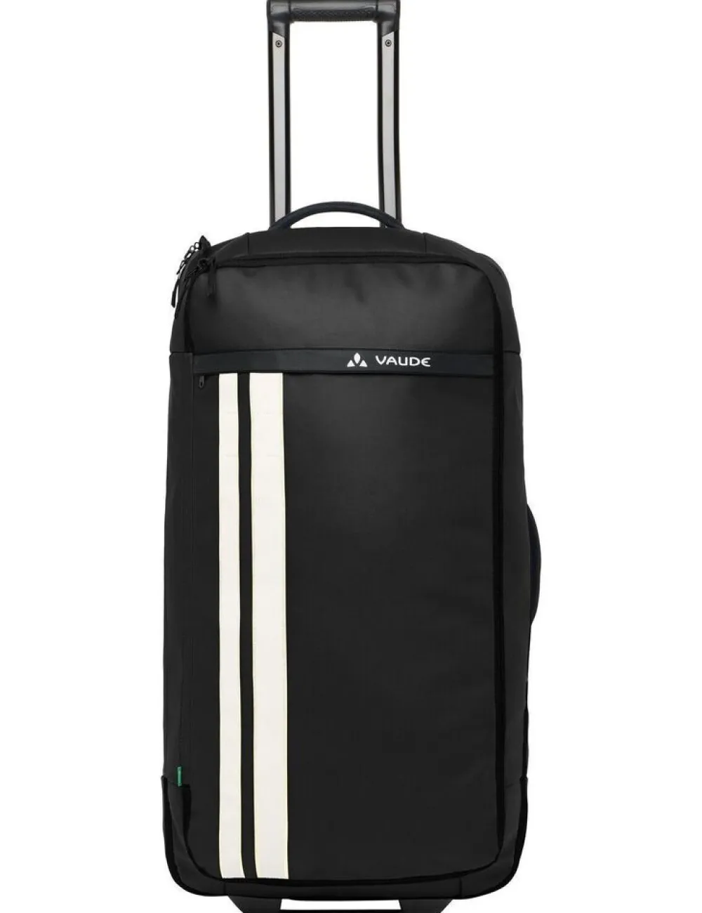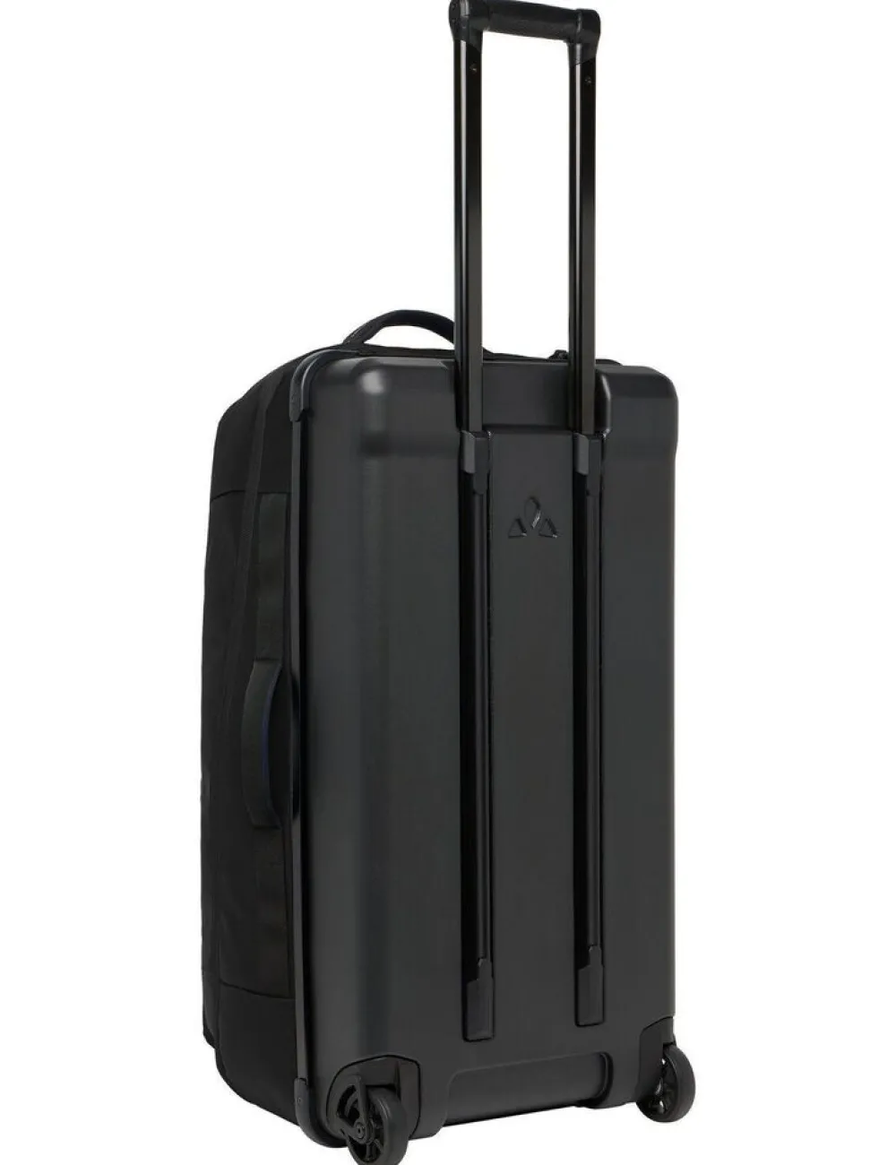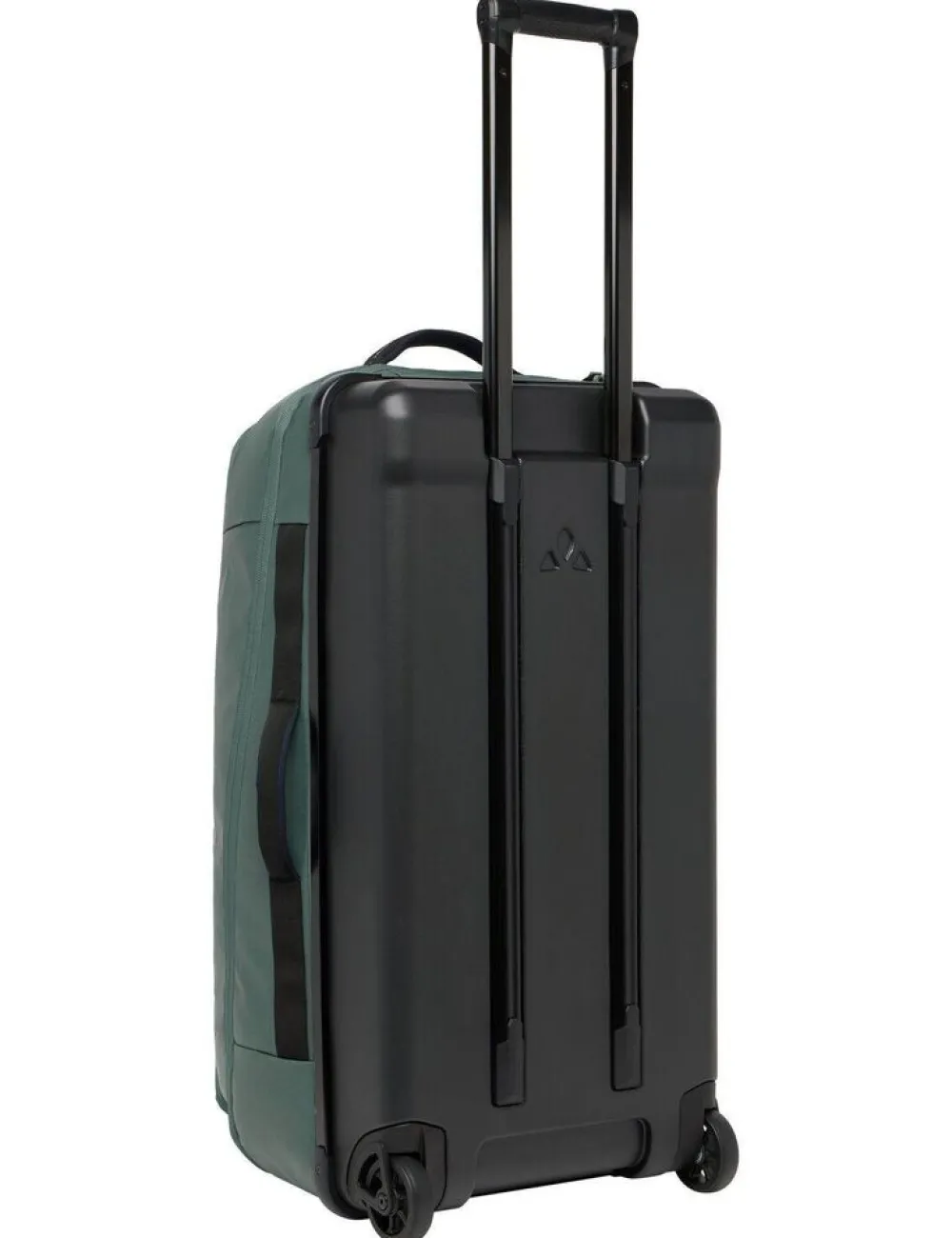 Zo gaat’ie duurzaam! Op reis biedt deze 90 liter reistrolley voldoende ruimte voor bagage, die dankzij de pakriemen en de net-tussenbodem met ritssluiting netjes gescheiden kan worden opgeborgen. Zacht gepolsterde handgrepen bieden flexibele draagmogelijkheden. Dankzij de stil lopende rubberen wieltjes en de uitschuifbare telescoopgreep kan de trolley ook over langere afstanden comfortabel worden voortgetrokken. Aan de voorkant zijn de twee VAUDE-cultstrepen reflecterend en bovendien voorzien van praktische bevestigingslussen in het bovenste gedeelte. Hierin kunnen karabijnhaken, koorden of zelfs veterschoenen worden gestoken. Om deze 90 liter reistrolley op te vouwen, wordt eenvoudigweg het torsiebestendige binnenframe losgemaakt en het textielmateriaal in de harde schaal gelegd. Dit bespaart zo’n 20 centimeter diepte, waardoor de reistrolley ook in een smalle nis of bovenop de kast opgeborgen kan worden. Ten slotte schittert deze milieuvriend met een voorheen onbereikbare repareerbaarheid: alle ritssluitingen, de wielen, de voetstandaard en de randbescherming zijn vervangbaar. Dit scheelt afval en kosten! De robuuste harde schaal en het duurzame, PVC-vrije canvasmateriaal zijn bestand tegen een ruwe behandeling tijdens bus- en vliegtuigreizen en zijn bovendien ongevoelig voor vocht en vuil. Hierdoor is deze door en door duurzame trolley een betrouwbare reisgenoot voor vele jaren. Het VAUDE Green Shape-label staat voor een milieuvriendelijk, functioneel product van duurzame materialen.
