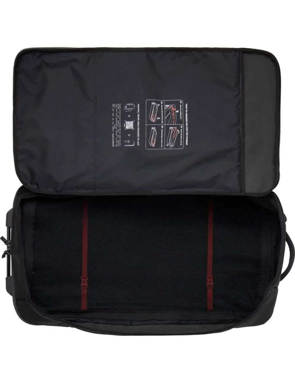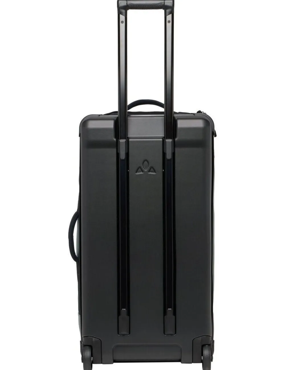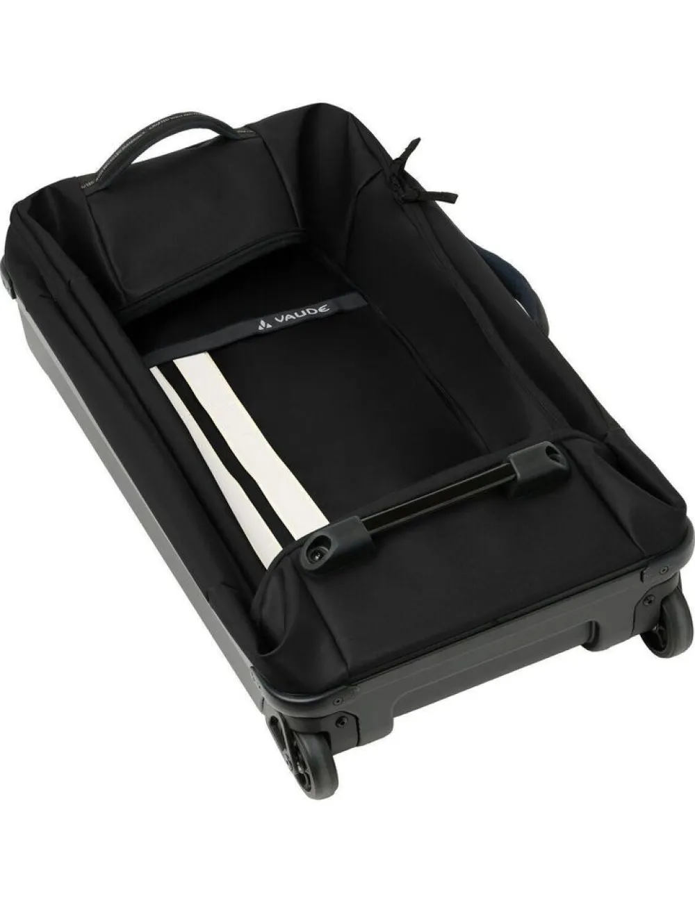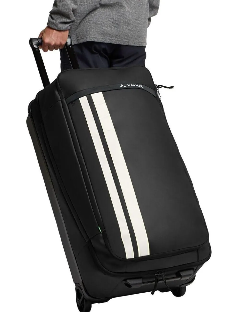 Zo gaat’ie duurzaam! Op reis biedt deze 90 liter reistrolley voldoende ruimte voor bagage, die dankzij de pakriemen en de net-tussenbodem met ritssluiting netjes gescheiden kan worden opgeborgen. Zacht gepolsterde handgrepen bieden flexibele draagmogelijkheden. Dankzij de stil lopende rubberen wieltjes en de uitschuifbare telescoopgreep kan de trolley ook over langere afstanden comfortabel worden voortgetrokken. Aan de voorkant zijn de twee VAUDE-cultstrepen reflecterend en bovendien voorzien van praktische bevestigingslussen in het bovenste gedeelte. Hierin kunnen karabijnhaken, koorden of zelfs veterschoenen worden gestoken. Om deze 90 liter reistrolley op te vouwen, wordt eenvoudigweg het torsiebestendige binnenframe losgemaakt en het textielmateriaal in de harde schaal gelegd. Dit bespaart zo’n 20 centimeter diepte, waardoor de reistrolley ook in een smalle nis of bovenop de kast opgeborgen kan worden. Ten slotte schittert deze milieuvriend met een voorheen onbereikbare repareerbaarheid: alle ritssluitingen, de wielen, de voetstandaard en de randbescherming zijn vervangbaar. Dit scheelt afval en kosten! De robuuste harde schaal en het duurzame, PVC-vrije canvasmateriaal zijn bestand tegen een ruwe behandeling tijdens bus- en vliegtuigreizen en zijn bovendien ongevoelig voor vocht en vuil. Hierdoor is deze door en door duurzame trolley een betrouwbare reisgenoot voor vele jaren. Het VAUDE Green Shape-label staat voor een milieuvriendelijk, functioneel product van duurzame materialen.