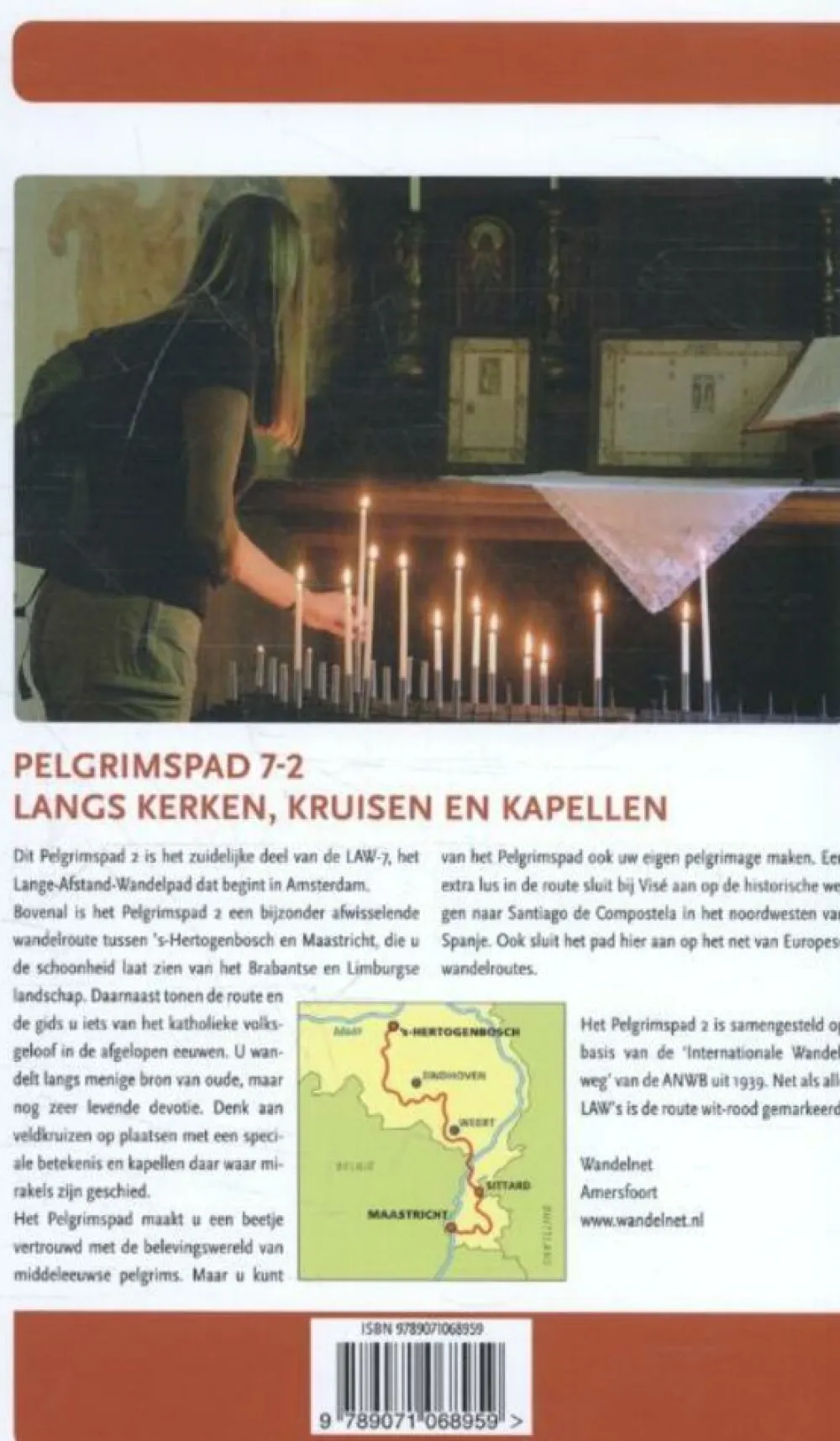 Pelgrimspad 7-2 Langs kerken, kruisen en kapellen Dit Pelgrimspad 2 is het zuidelijke deel van de LAW 7, het Lange-Afstand-Wandelpad dat begint in Amsterdam. Bovenal is dit Pelgrimspad 2 is een bijzonder afwisselende wandelroute tussen ‘s-Hertogenbosch en Maastricht, die u de schoonheid laat zien van het Brabantse en Limburgse landschap. Daarnaast tonen de route en de gids u iets van het katholieke volksgeloof in de afgelopen eeuwen. U wandelt langs menige bron van oude, maar nog zeer levende devotie. Denk aan veldkruizen op plaatsen met een speciale betekenis en kapellen daar waar mirakels zijn geschied. Het Pelgrimspad maakt u een beetje vertrouwd met de belevingswereld van middeleeuwse pelgrims. Maar u kunt van het Pelgrimspad ook uw eigen pelgrimage maken. Een extra lus in de route sluit bij Visé aan op de historische wegen naar Santiago de Compostela in het noordwesten van Spanje. Ook sluit het pad hier aan op het net van Europese wandelroutes. Het Pelgrimspad deel 2 is samengesteld op basis van de ‘Internationale Wandelweg’ van de ANWB uit 1939. Net als alle LAW’s is de route wit-rood gemarkeerd.