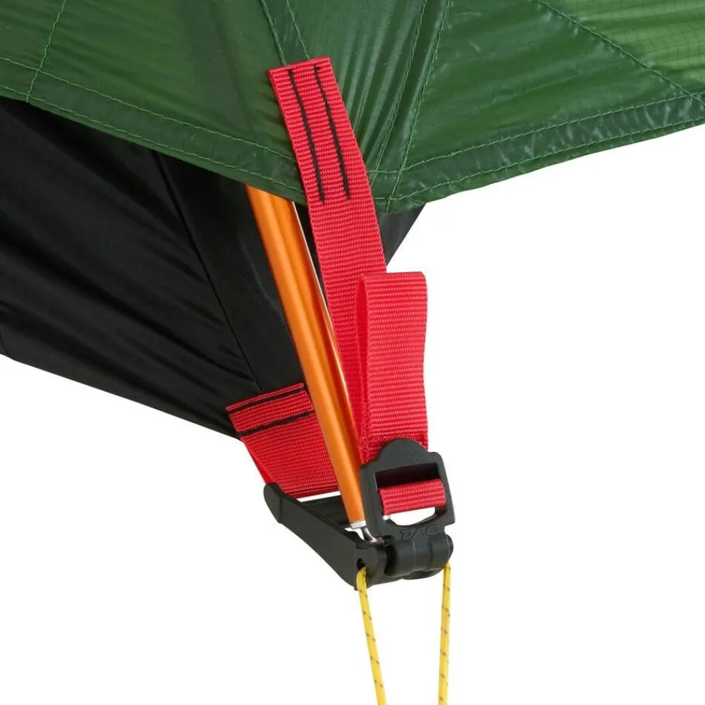 erover is uitgerekt. Voor een bescherming tegen zeer lichte weersomstandigheden, kan het vliegvel worden ingesteld met behulp van het grondzeil. De binnentent is uitgerust met muskietengaas in de deuren en aan de voet en aan het hoofdeinde. Extra binnententzakken zorgen voor orde en opbergruimte.
