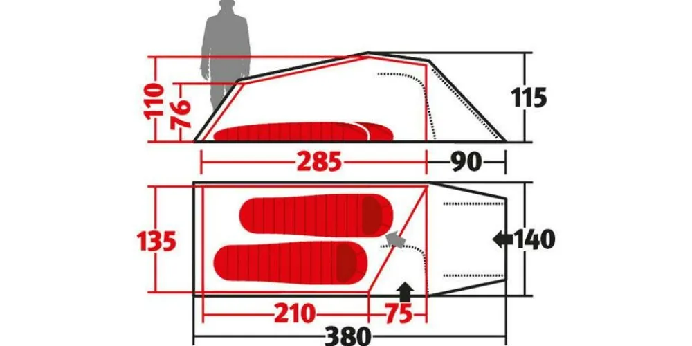 De Outpost 2 Travel Line van Wechsel biedt dankzij de schuin gevormde binnentent ook voldoende ruimte voor grotere personen om na een inspannende outdoordag te kunnen uitrusten. In de voortent kun je dankzij de steile wanden ook met z’n tweeën gezellig zitten, avondeten eten en de dag nog eens doornemen. De grote ingang aan de voorkant zorgt er daarbij voor dat je ondertussen nog van het uitzicht kunt genieten. Bij slecht weer kun je echter ook de kleine zijingang gebruiken. Om te voorkomen dat de voortent te warm wordt, heeft ze een grote verluchtingsopening in het dak, die vooral op zonnige dagen zeer nuttig is. Voor de luchttoevoer in de binnentent zorgt een verluchtingsopening achteraan, die samen met het muggengaas in de D-vormige tentdeur een goede zuurstofcirculatie creëert. De buitentent en het grondzeil zijn stevig, gaan lang mee en zijn waterafstotend. Het grondzeil heeft dankzij een PU-coating zelfs een waterkolom van 7000 mm. Vocht van de bodem kan zo niet binnendringen in de tent. De tunneltent is asymmetrisch waardoor de Outpost 2 zeer stormvast is. Hevig wapperen van het tentdoek wordt zo vermeden. De tunneltent biedt veel ruimte, goede ventilatie en stabiliteit en is daarom ideaal voor langere kampeervakanties.