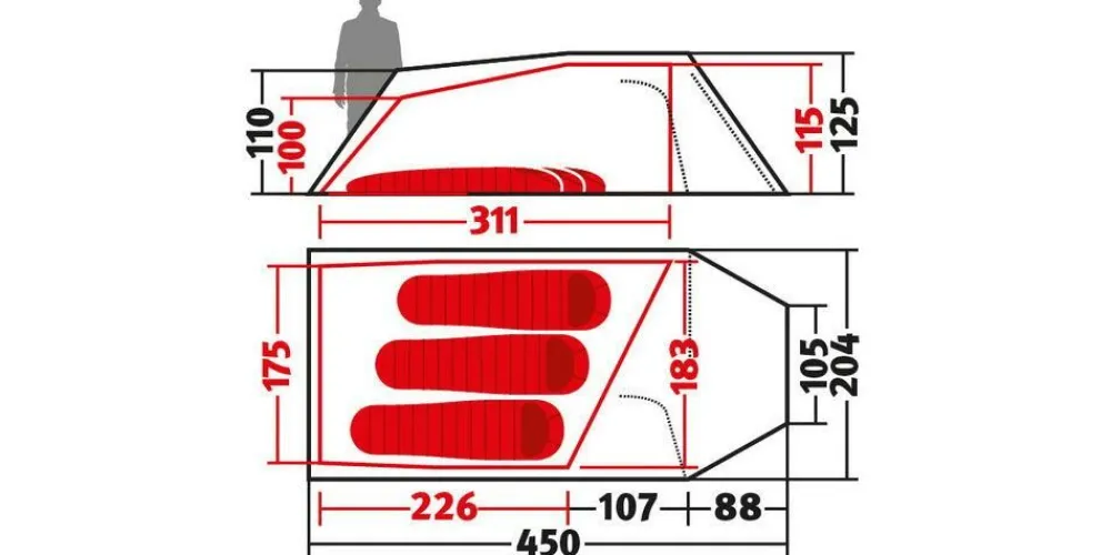 - Binnentent:(LxWxH) 226/295 x 183 x 115 cm