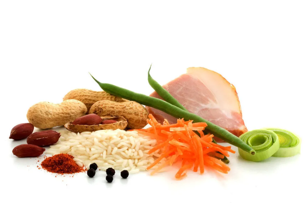 50% rijst, 9% pinda’s, suiker, tarwemeel, weipoeder, 6% ham (varkensvlees, tarwezetmeel, zout, rookextract, voedingszuur (rozemarijnextract, citroenzuur), conserveermiddel (E250)), ui, wortel, prei, peterselie, 4% palmvet, 3% sperziebonen, 0.04