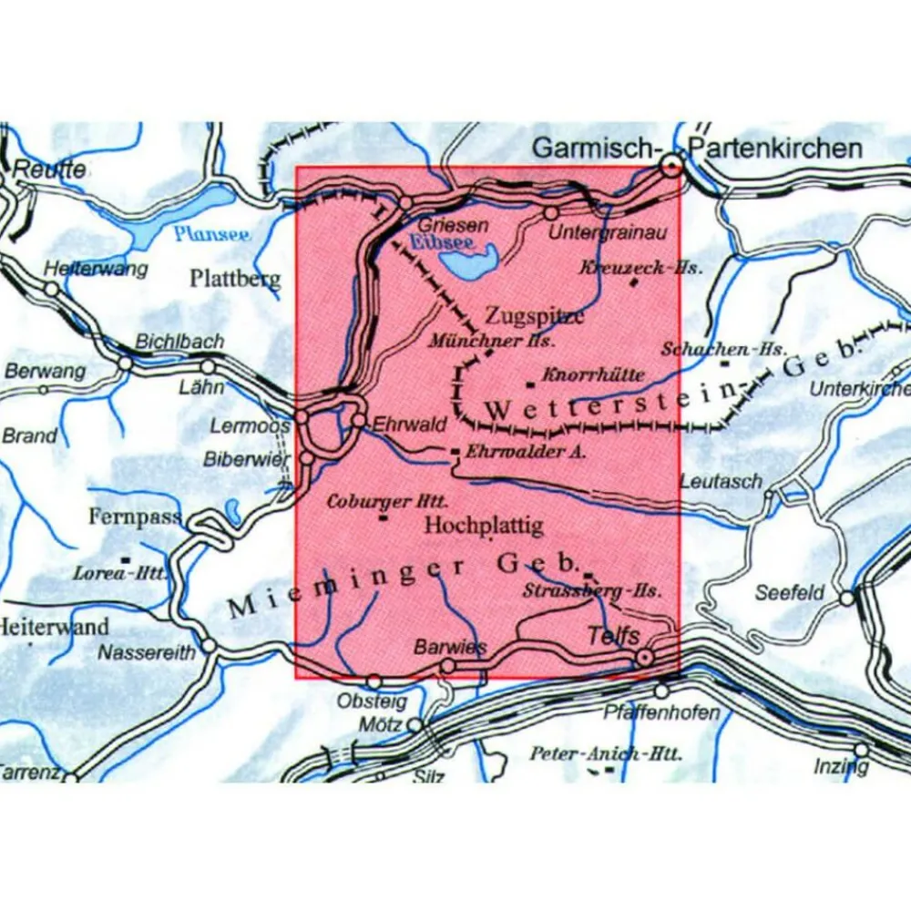 Uitstekende topografische gecombineerde wandelkaart/klimkaart 04/2 Wetterstein- und Mieminger Gebirge Mitte ten zuidwesten van Garmisch-Partenkirchen.