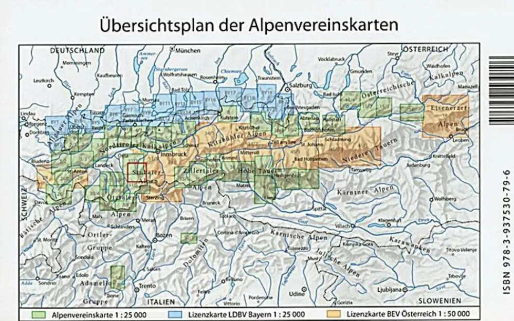 -wandelpaden ingetekend en gemarkeerd met nummer van de Österreichischer Alpenverein