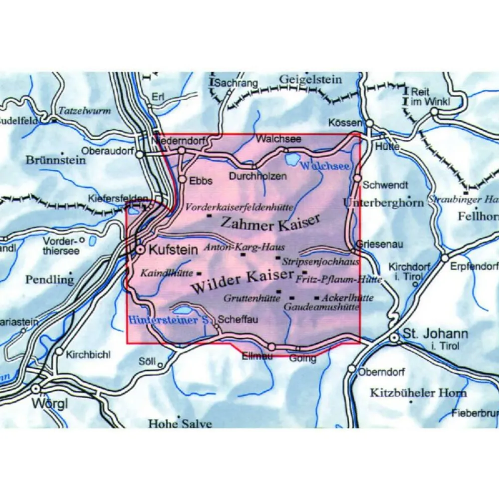 Plaatsen en bergtoppen op de kaart: Wilder Kaiser, Ebbs, Kufstein, Zahmer Kaiser, Walchsee.