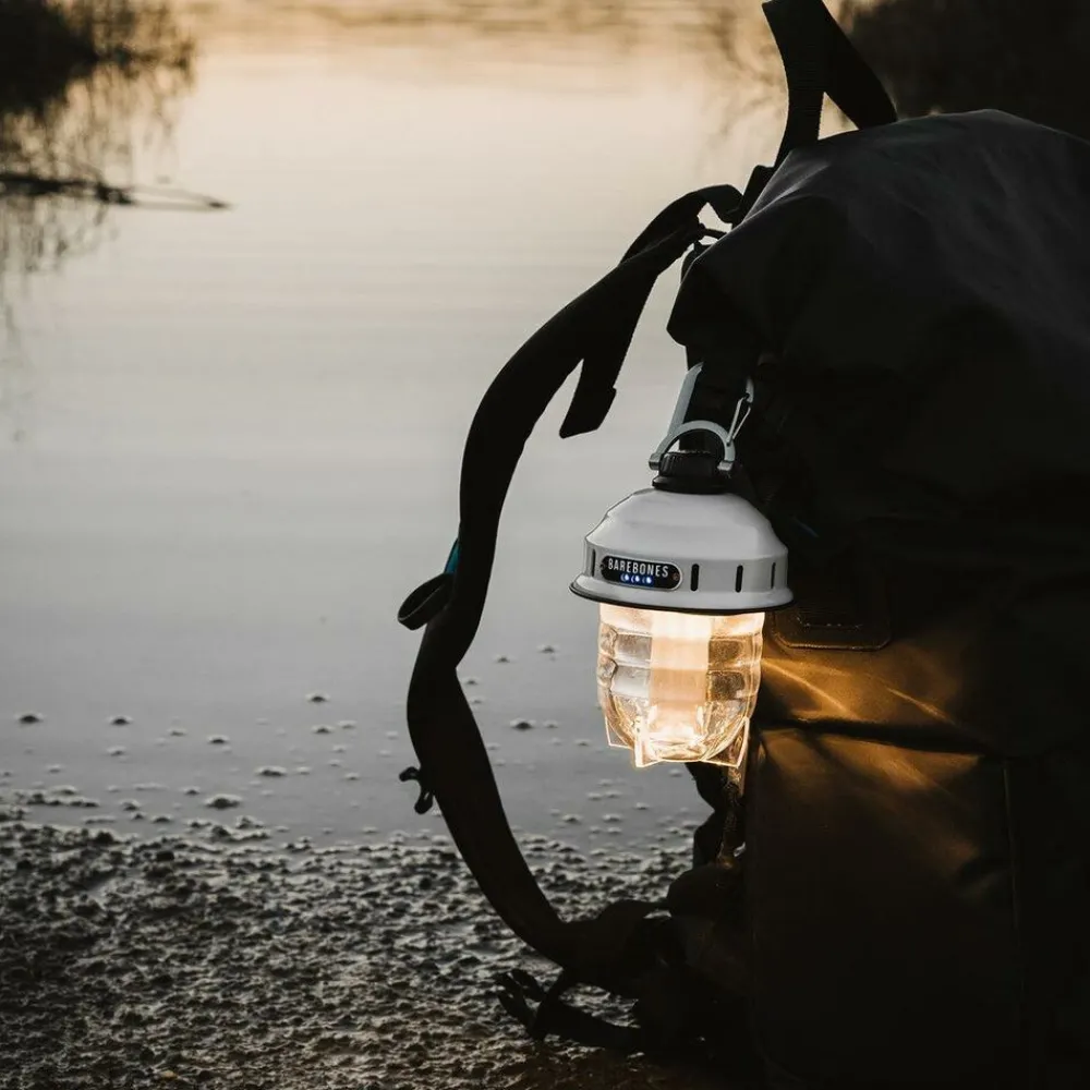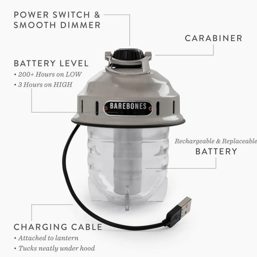 De Barebones Beacon Light heeft een traploze dim functie. Ophangen van de lamp is zeer eenvoudig door de karabijnhaak. De lithium oplaadbare batterij wordt opgeladen door de 75 cm usb-kabel. Door de handige batterij-indicator zit u nooit meer in het donker.