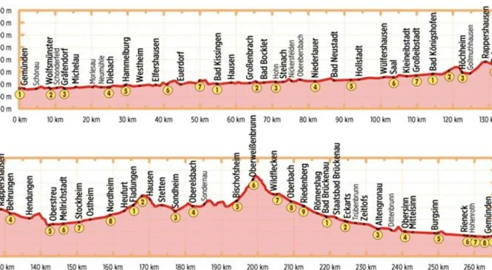 Ab dem Startpunkt Gemünden am Main radeln Sie bis nach Bad Königshofen an der rund 135 Kilometer langen Fränkischen Saale entlang. Im Tal des Flusses können Sie viele Sehenswürdigkeiten und Besonderheiten entdecken: Hammelburg, welches sich mit dem Titel der ältesten Weinstadt Frankens schmückt, die Erdfunkanlage in der Nähe von Westheim, die weithin sichtbare Ruine der Trimburg und die herrschaftlichen Kuranlagen von Bad Kissingen, Bad Neustadt und Bad Königshofen. Ab Bad Königshofen führt der Radweg durch das hügelige und ruhige Grabfeld, welches nicht zur Rhön sondern zum südwestdeutschen Stufenland gehört, bis nach Mellrichstadt.