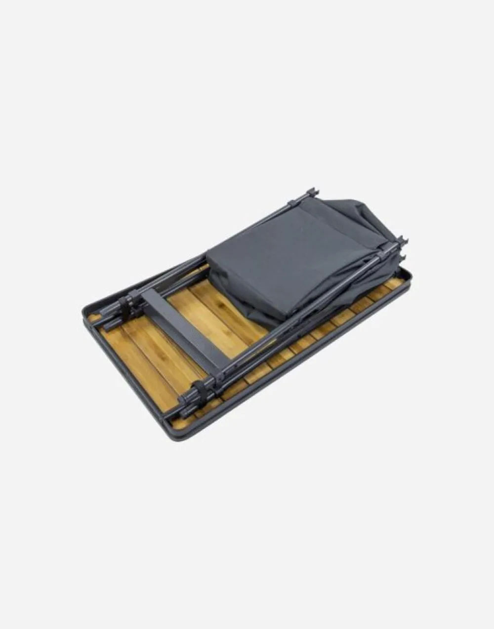 De Opbergkast/bijzettafel Maligne van Bo-Camp is een stijlvolle kookkast met aluminium frame. Het meubel is voorzien van een bamboe blad. Verder is de kast compact opvouwbaar in de bijgeleverde draagtas door de poten naar elkaar toe te schuiven en neer te liggen onder het blad. De kast bestaat uit 1 vak waar een stevige inlegplak in ligt. Ook is het tafelblad hittebestendig en watervast.