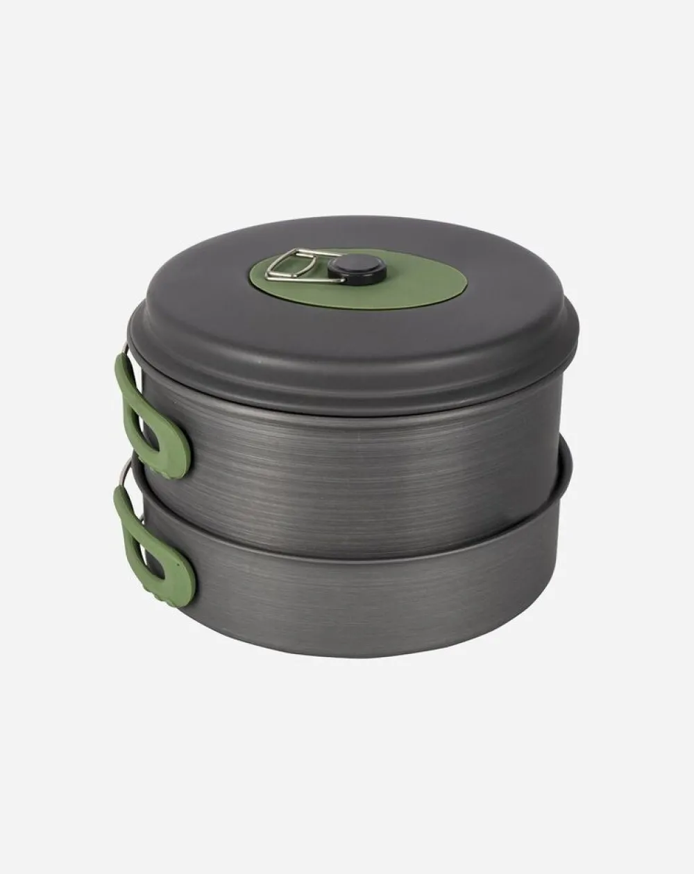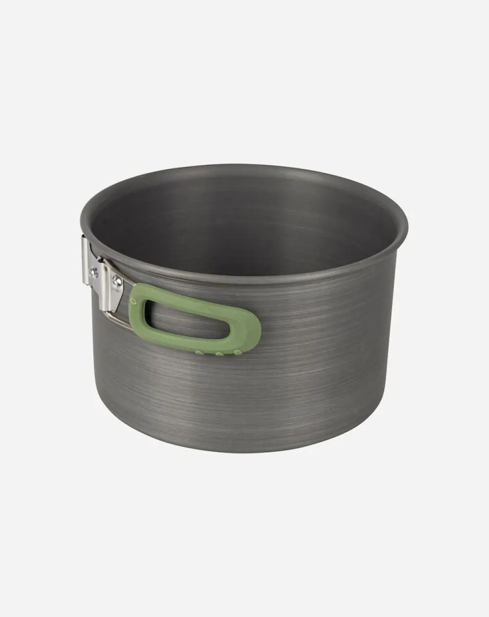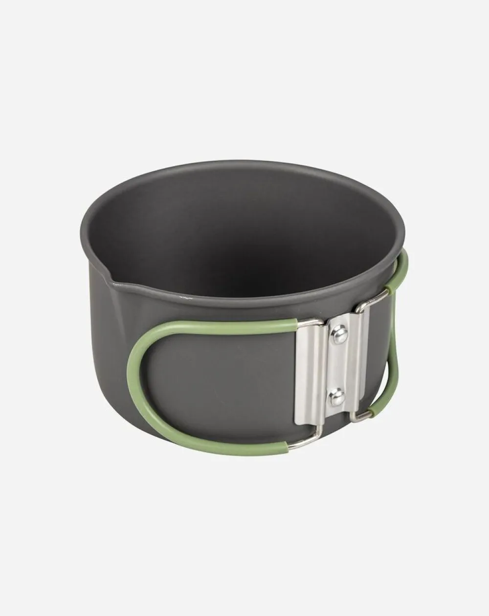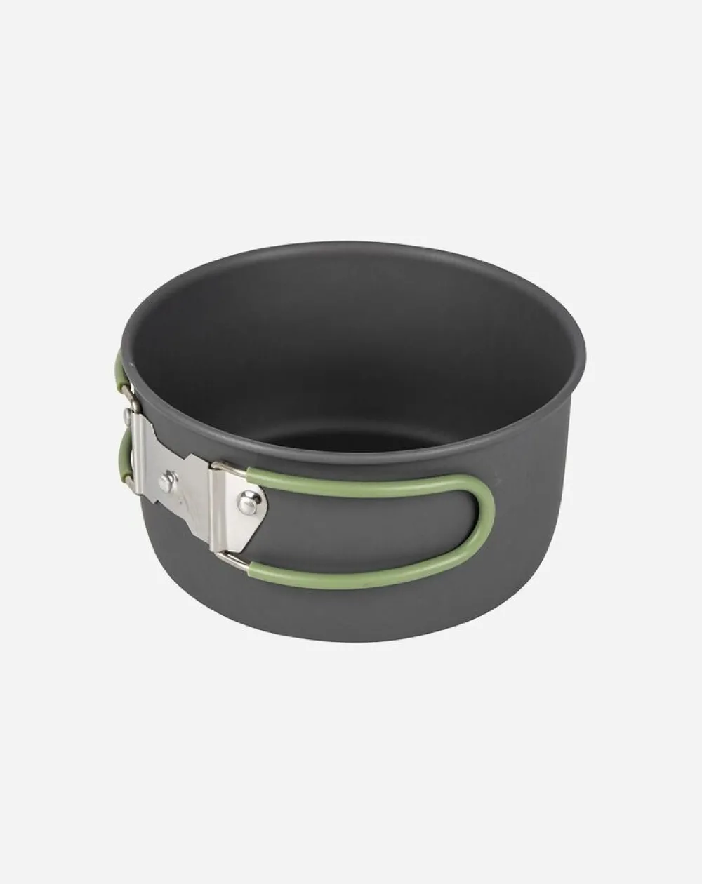 Een complete 4-delige lichtgewicht kookset. Deze pannenset bestaat uit 3 kookpannen met een deksel en een koekenpan. Bij uitstek geschikt voor outdoor gebruik. Geschikt voor gas en benzinebranders. Gemaakt van stevig hard geanodiseerd aluminium waardoor er een verminderde kans is op aanbakken. Iedere pan is voorzien van een hittebestendige siliconen klapgreep. Deze handgrepen kunnen na gebruik eenvoudig om de pan worden geklapt zodat de pannen compact op te bergen en vervoeren zijn. Inclusief foedraal.