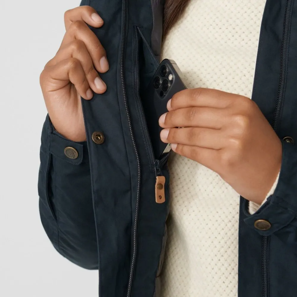 De slijtvaste buitenstof maakt de parka ook geschikt voor wandelingen in het bos. Het model is lang en verwarmt zitvlak en dijen. De rits werkt twee kanten op en heeft een beschermende overslag aan zowel de binnen- als de buitenkant om de koude wind tegen te houden. Het jack heeft een borstzak en twee steekzakken, alle met rits.