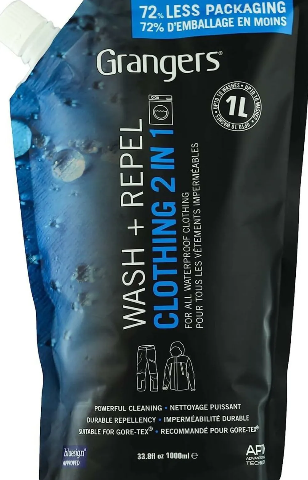 Granger’s 2 in 1 Wash & Repel heeft een geavanceerde formule om alle outdoorkleding te reinigen en water- en vuilafstotend te maken in één wascyclus. Bespaart tijd, energie en water. De waterafstotende eigenschappen zijn door warmte (wasdroger, strijkbout of verwarming) te activeren.