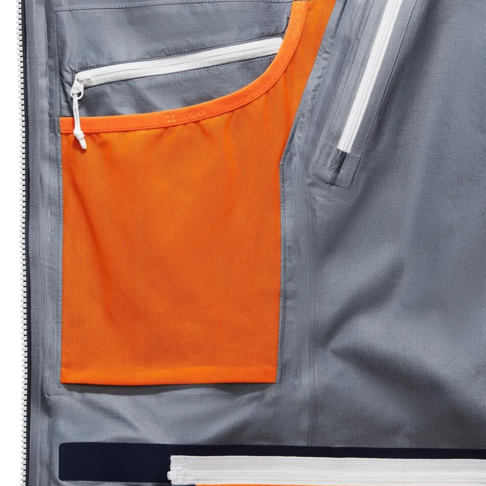 - Twee voorzakken compatibel met klimharnassen, voorzien van waterdichte ritsen.