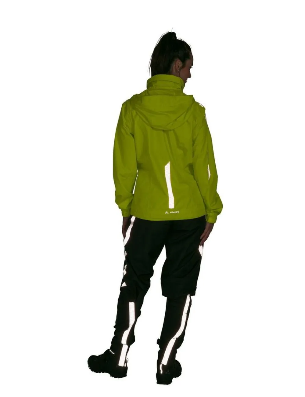Permanente regenbescherming met grote, reflecterende elementen. Dit lichtgewicht 2-laags regenjack met dunne meshvoering is met Ceplex Active zeer goed ademend en beschermt je betrouwbaar tegen nattigheid en wind. De reflectoren verhogen je zichtbaarheid in het donker in het verkeer beduidend, omdat je juist in slechte omstandigheden waardevolle seconden eerder wordt gezien. Dit jack is TÜV-gecertificeerd als waarschuwingskleding en zorgt zo voor betere zichtbaarheid in de nacht. De capuchon kan opgerold in de kraag worden opgeborgen. De 2-weg ritssluiting aan de voorzijde, verstelbare manchetten en 2 voorzakken met ritssluiting ronden dit product comfortabel af. Dit product is met Eco Finish zonder fluorkoolstoffen (PFC) milieuvriendelijk waterafstotend gemaakt. Het VAUDE Green Shape-label staat voor een milieuvriendelijk, functioneel product van duurzame materialen.