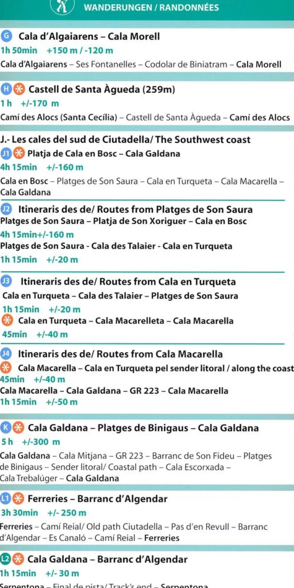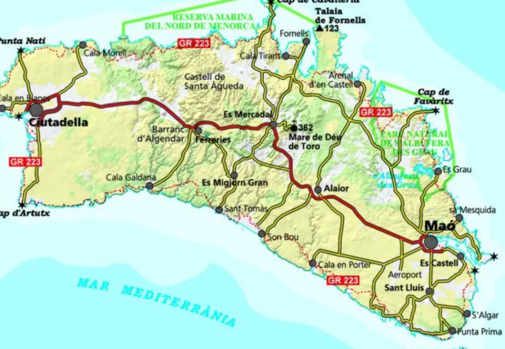 Zeer gedetailleerde wandelkaart en fietskaart (MTB) van Menorca. Met ingetekende wandelroutes en andere informatie. Spaanstalig, maar uitstekende kaart. Met symbolen voor bijvoorbeeld campings en stranden