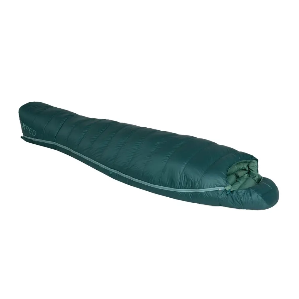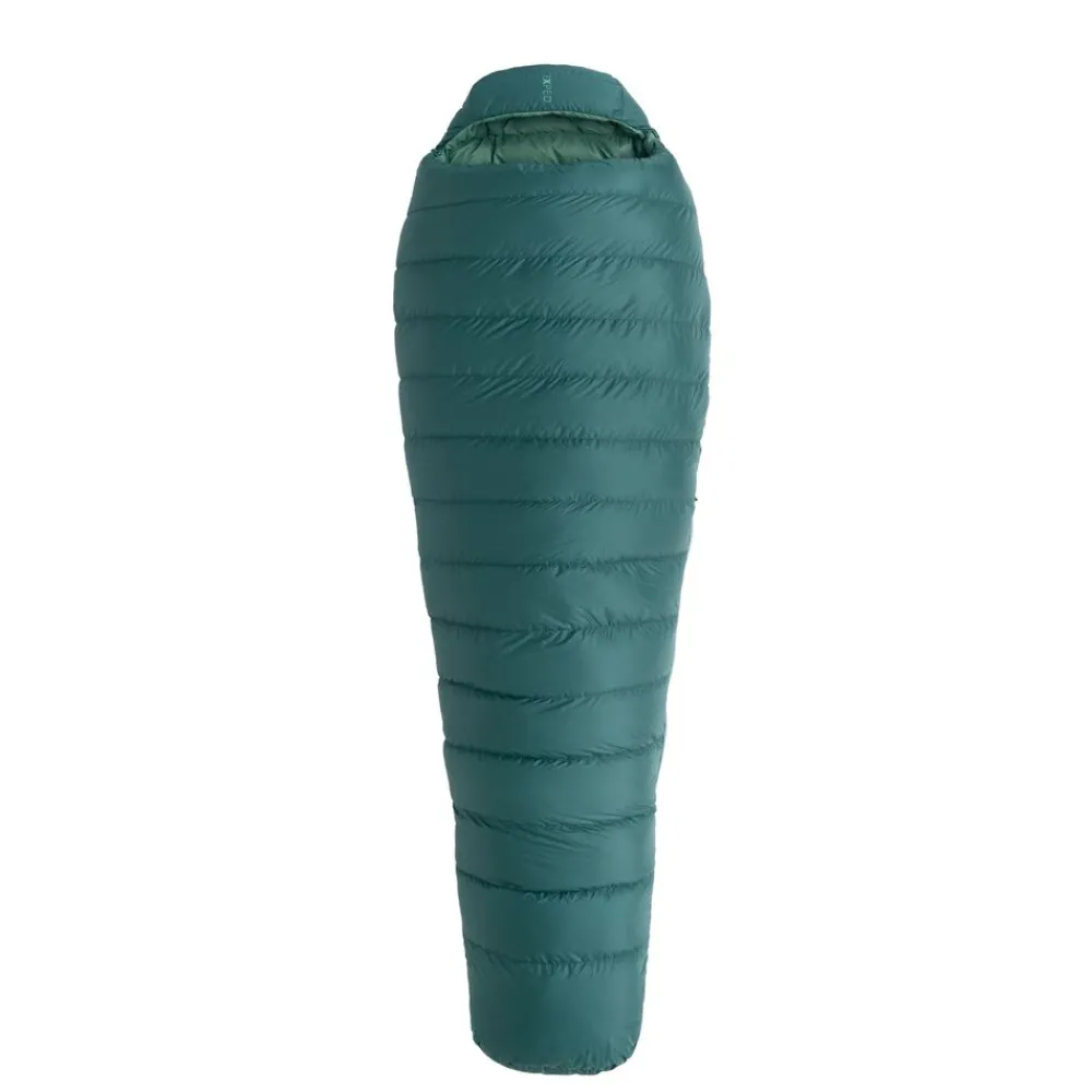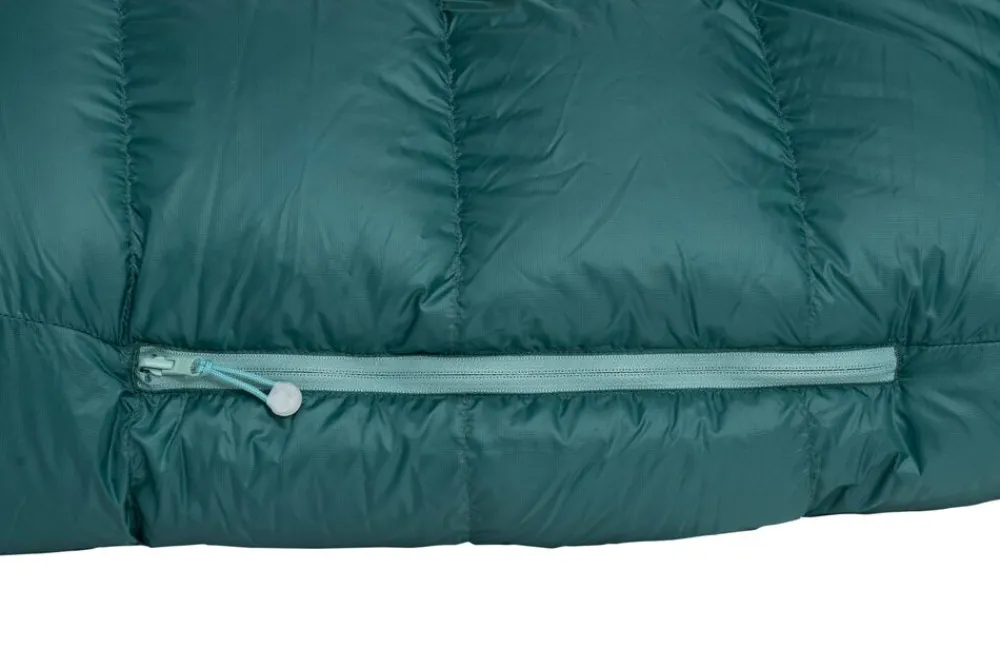 De buiten- en binnenmaterialen zijn gemaakt van gerecyclede stoffen en de vulling is uitsluitend RDS-gecertificeerd dons. De slaapzakken worden in Europa gevuld. Een waterdichte zak en een praktische opbergzak zijn bij de levering inbegrepen.