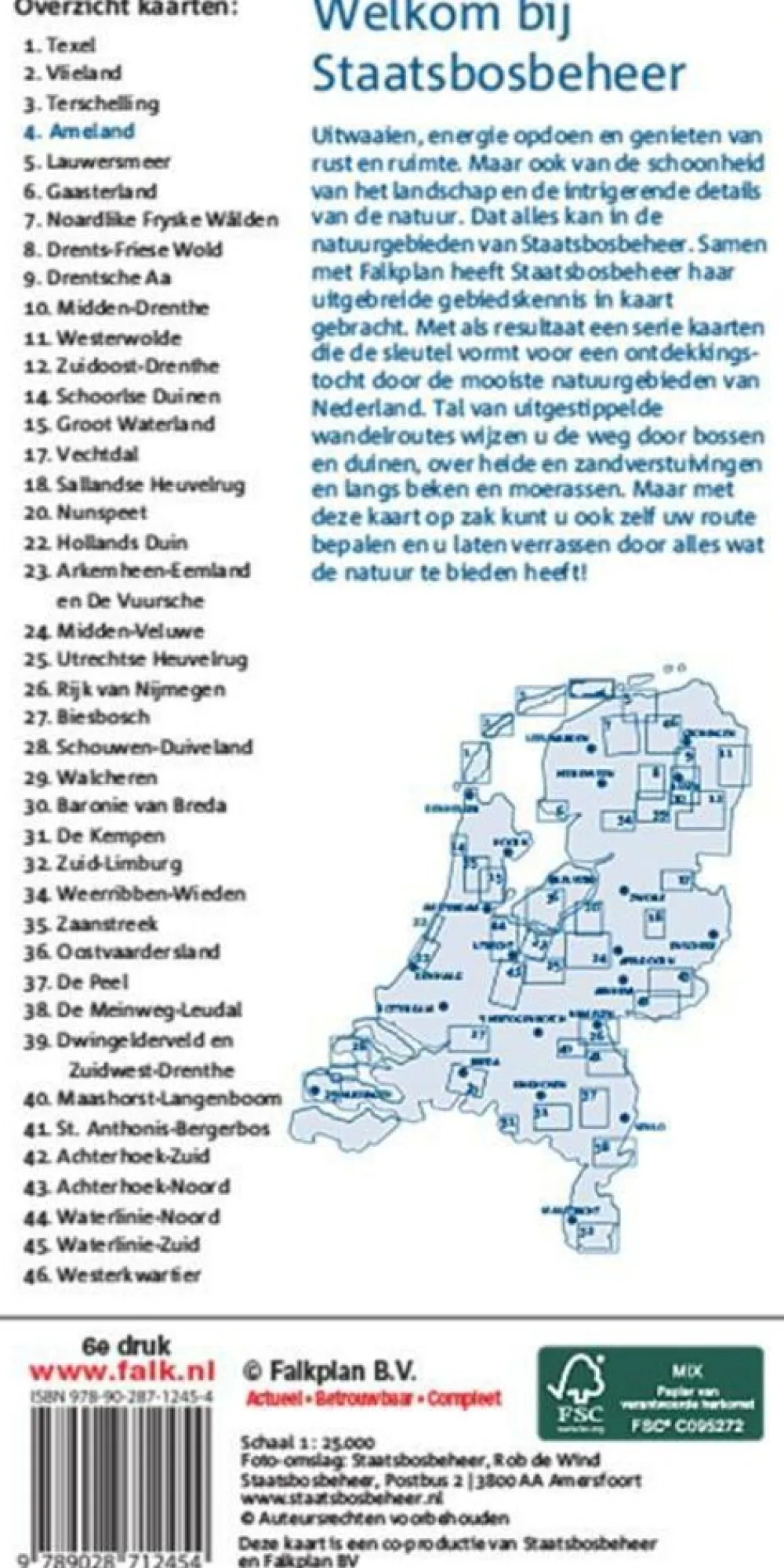 Ameland barst van de rijke natuur. Op deze smalle strook land tussen Noordzee en Waddenzee valt echt van alles te ontdekken. Pak de fiets of trek de wandelschoenen aan en zie wat Ameland te beleven heeft. je zult versteld staan! Lekker uitwaaien, energie opdoen en genieten van rust en ruimte in dit prachtige natuurgebied. Tal van uitgestippelde wandelroutes wijzen je de weg over het eiland. De Waddeneilanden zijn gekend als Unesco Werelderfgoed, vanwege de ondiepe Waddenzee waar een veelzijdigheid van dierlijk leven is gehuisvest. Ameland staat bekend als het eiland met de rijke natuur tussen twee zeeën. Met vier mooie, oude dorpjes, internationaal bekende natuurgebieden als het Oerd en de Hon, 27 kilometer wit blinkend Noordzeestrand, polders en kwelders, bos en duin, zoet en zout water, vogels en fietspaden: dat is Ameland in een notendop! Met de kaart van Falk Staatsbosbeheer (sbb) ga je mee op ontdekkingsreis door dit mooie natuurgebied. Tal van uitgestippelde wandelroutes wijzen je de weg door bossen en duinen, over heide en zandverstuivingen en wat nog niet meer zal zijn! Gemarkeerde wandelroutes Fietspaden Mountainbike routes Ruiterpaden Alle straten in het buitengebied Uitgebreid met toeristische en recreatieve informatie