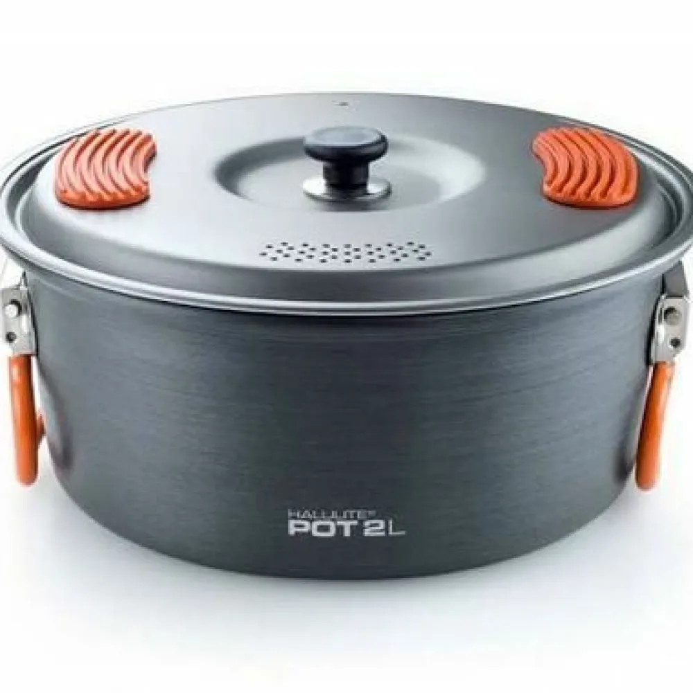De Halulite Pot 2 L van GSI is een geanodiseerde aluminium pan met inklapbare handvaten, die uitgeklapt vastklikken.Het deksel met geïntegreerde vergiet is voorzien van silicone pads om de inhoud af te gieten zonder je handen te branden. De pan glijdt niet van de brander af door de spiralen aan de onderzijde van de pan.