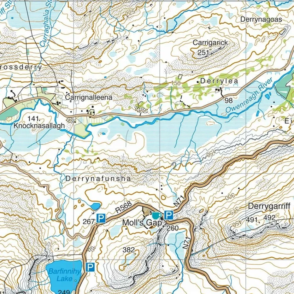 Zeer gedetailleerde, waterproof en scheurbestendige, gelamineerde topografische wandelkaart van het gebergte Macgillycuddy’s Reeks op het schiereiland Iveragh in County Kerry nabij het Nationale Park en de meren van Killarney