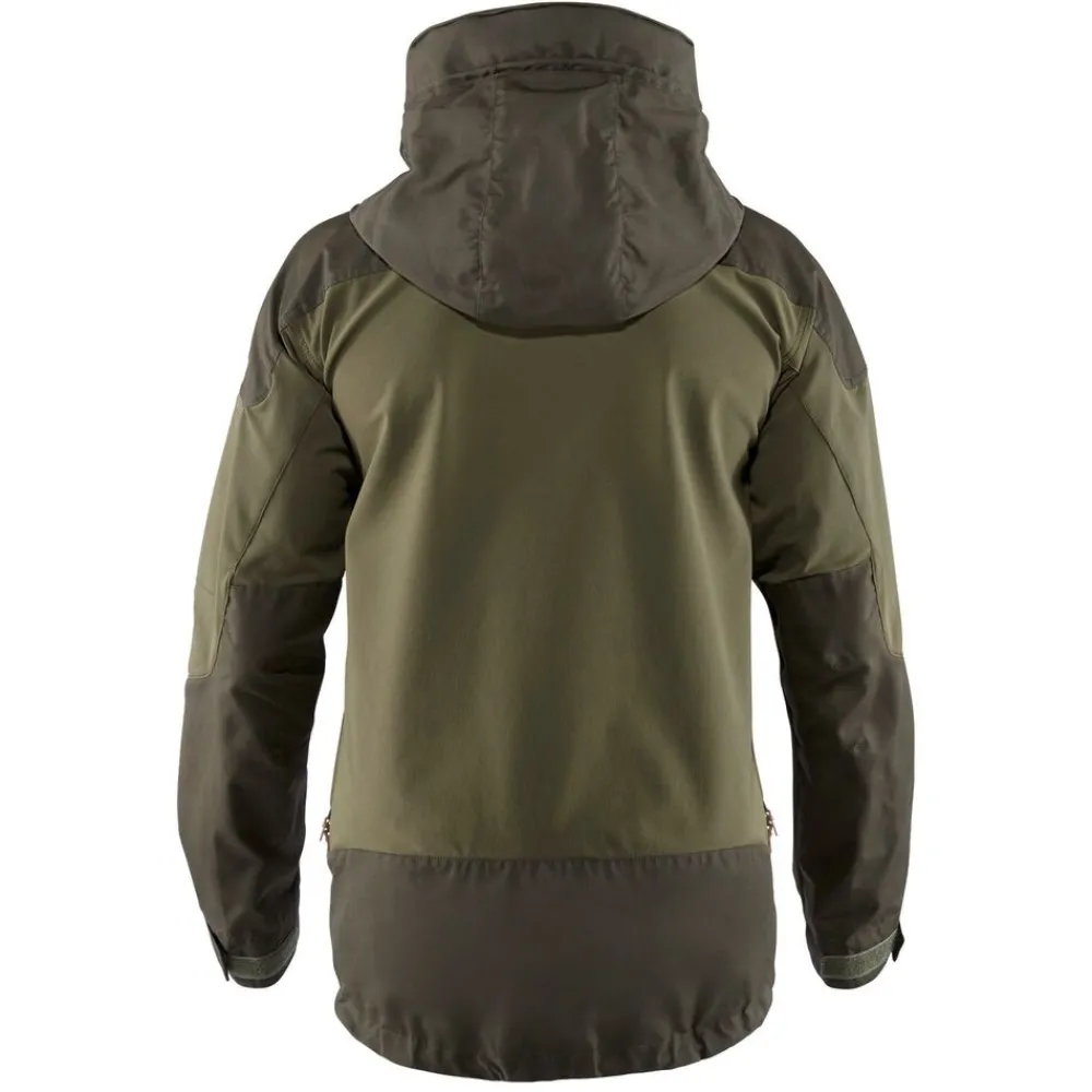 Het Keb Jacket M van Fjällräven is een technische outdoorjas, waarbij bewegingsvrijheid en ademend vermogen minstens zo belangrijk is als slijtvastheid. Dit wordt bereikt door een combinatie van wind- en waterafstotend G-1000® Eco van gerecycled polyester en ecologisch katoen op de capuchon, schouders, voorzijde en het verlengde rugpand en stretch in het rugpand, de mouwen en zakken.