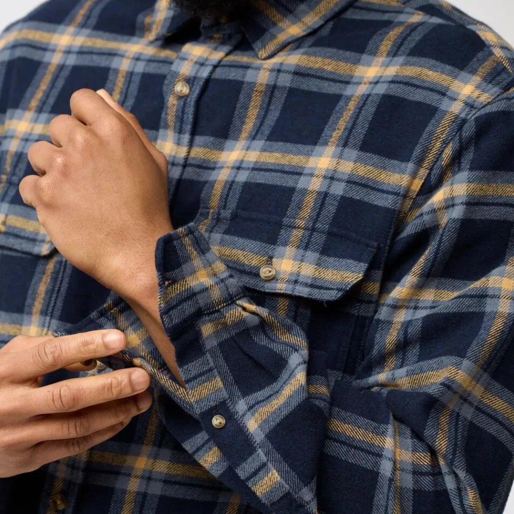 Het Övik Heavy Flannel Shirt M van Fjällräven is een lange mouwen blouse gemaakt van aan beide zijden geborsteld biologisch katoenen flanel. Het overhemd heeft twee borstzakken met knoopjes en sluit ook met (gerecycled polyester) knopen.